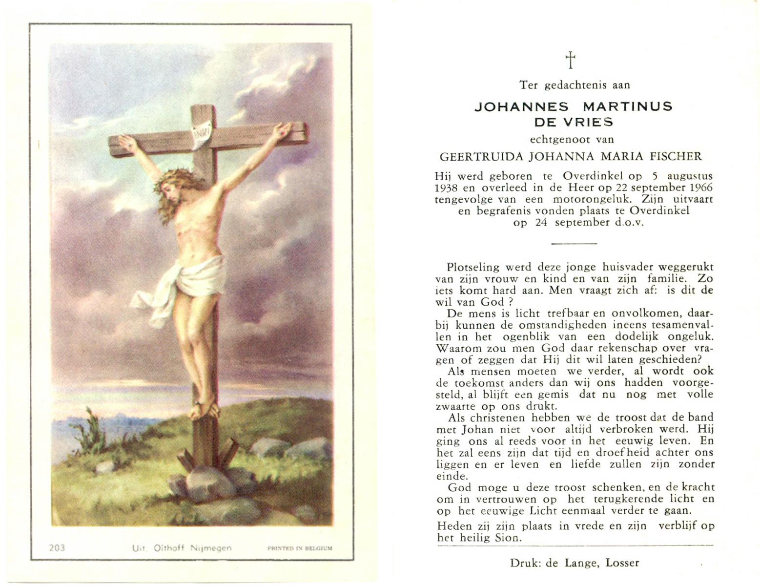 VRIES, de, Johannes Martinus, geboren op 5-8-1938 te Overdinkel, overleden op 22-9-1966 op 28-jarige leeftijd, begraven op 24-9-1966 te Overdinkel.