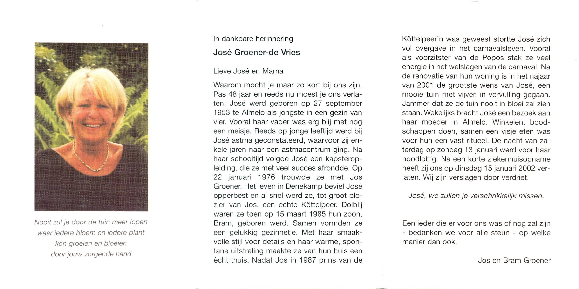 VRIES, de, José, geboren op 27-9-1953 te Almelo, overleden op 15-1-2002 op 48-jarige leeftijd.