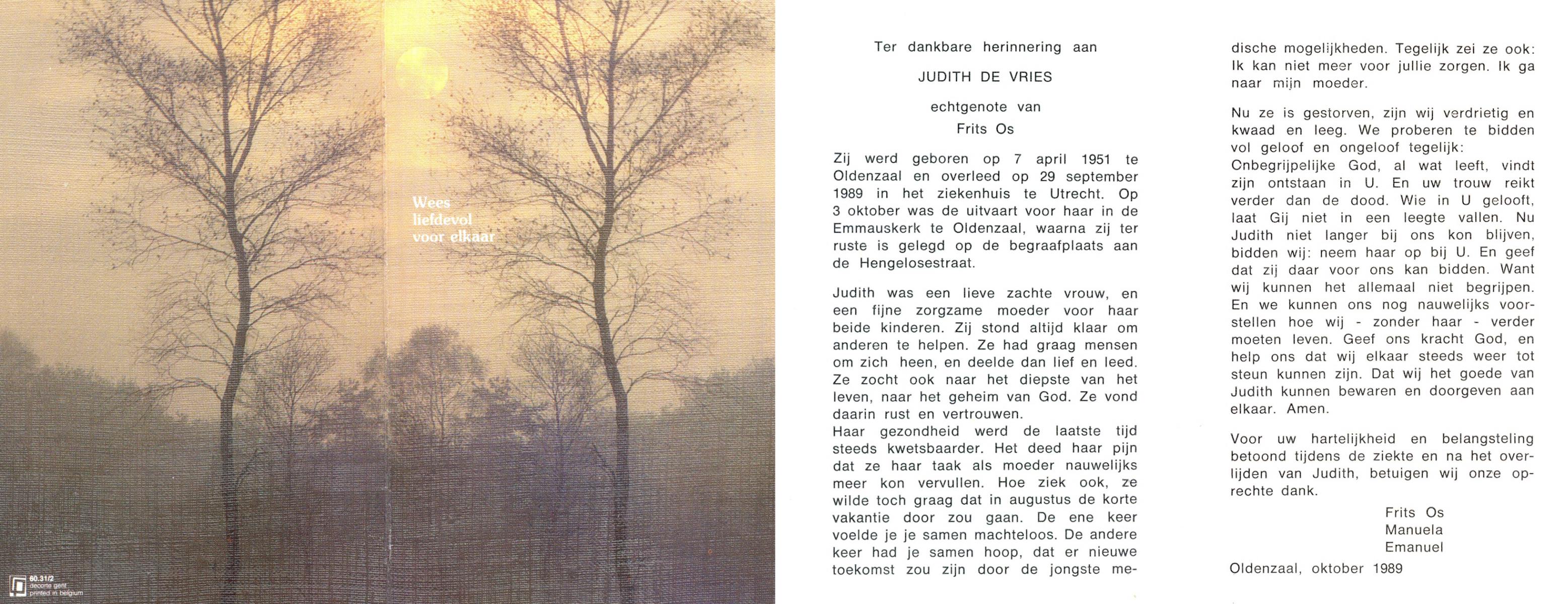 VRIES, de, Judith, geboren op 7-4-1951 te Oldenzaal, overleden op 29-9-1989 te Utrecht op 38-jarige leeftijd, begraven op 3-10-1989 te Oldenzaal.