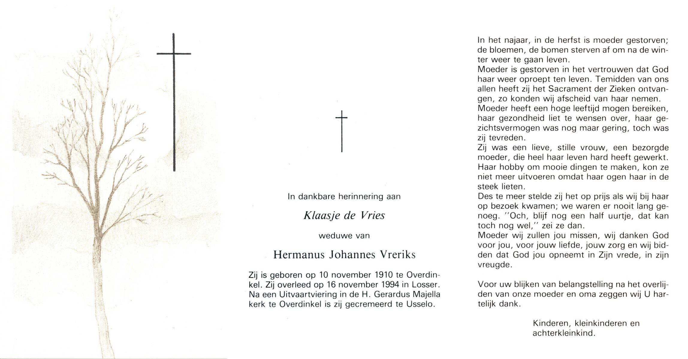 VRIES, de, Klaasje, geboren op 10-11-1910 te Overdinkel, overleden op 16-11-1994 te Losser op 84-jarige leeftijd, gecremeerd te Usselo.