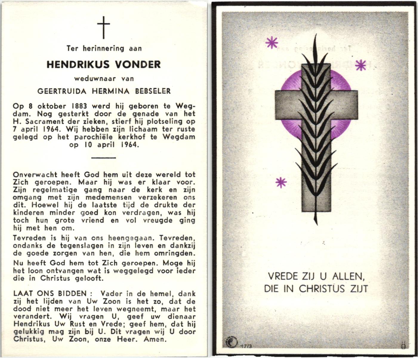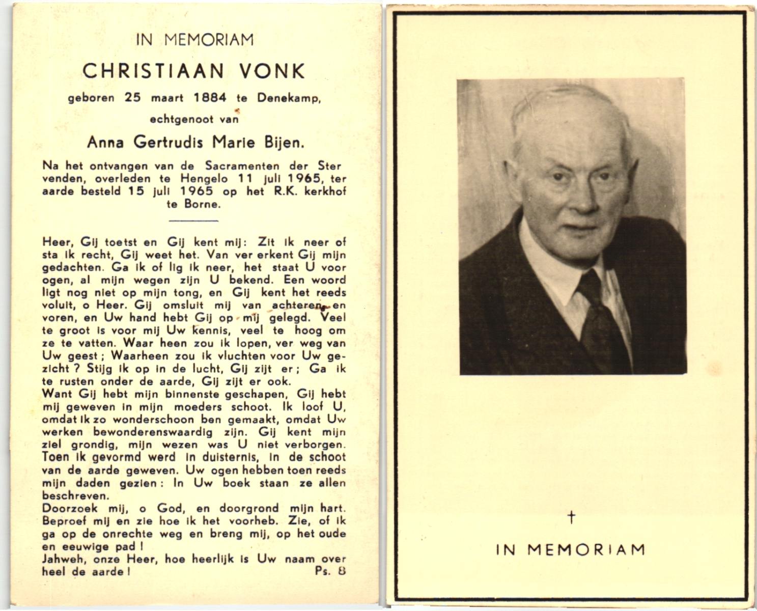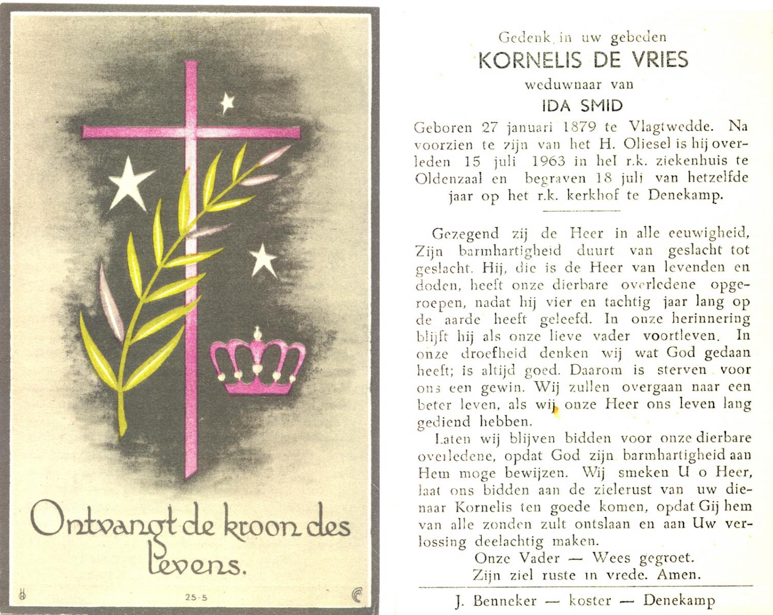VRIES, de, Kornelis, geboren op 27-01-1879 te Vlagtwedde, overleden op 15-7-1963 te Oldenzaal op 84-jarige leeftijd, begraven op 18-7-1963 te Denekamp R.K.kerkhof.