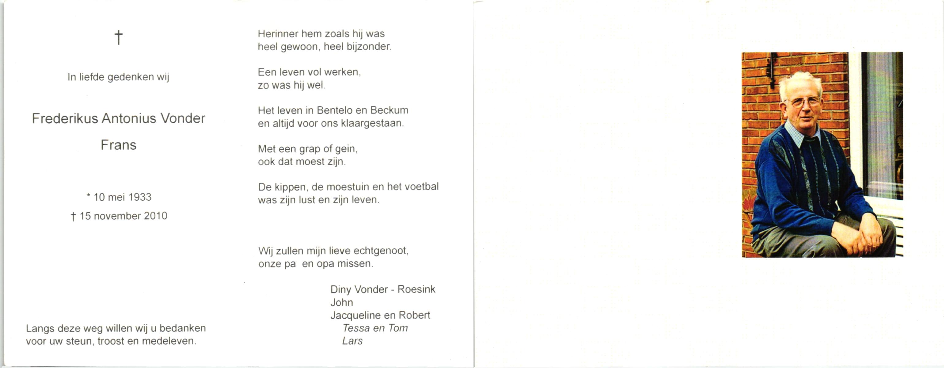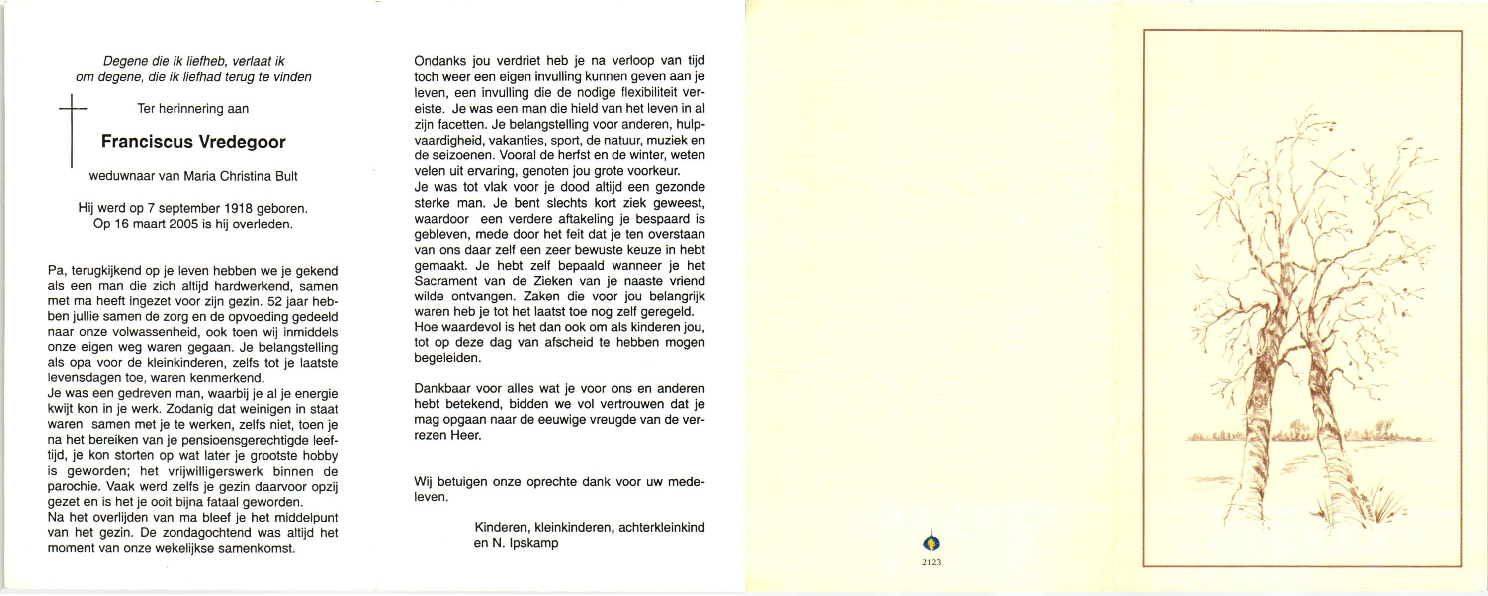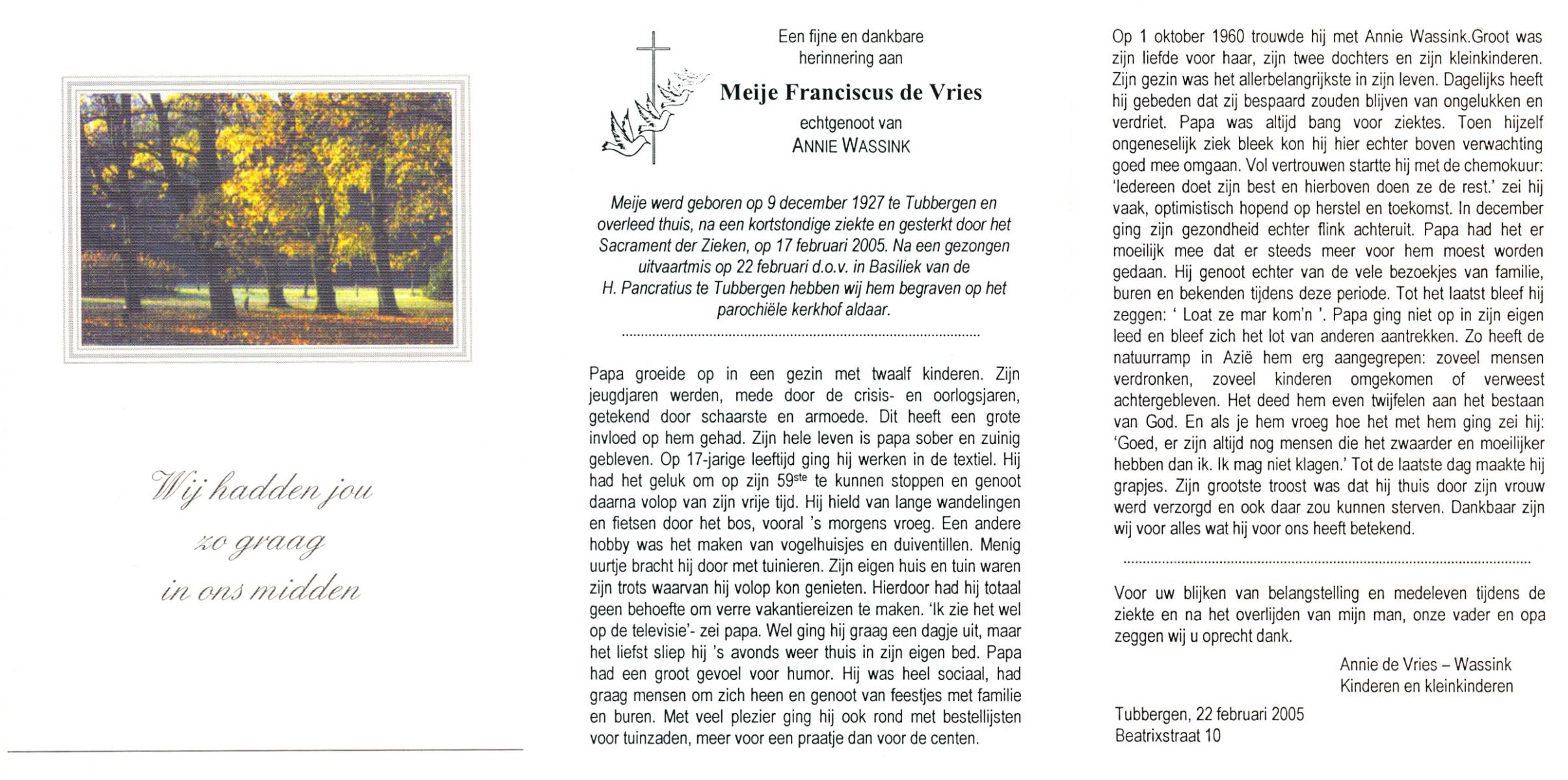 VRIES, de, Meije Franciscus, geboren op 9-12-1927 te Tubbergen, overleden op 17-2-2005 op 77-jarige leeftijd, begraven op 22-2-2005 te Tubbergen.
