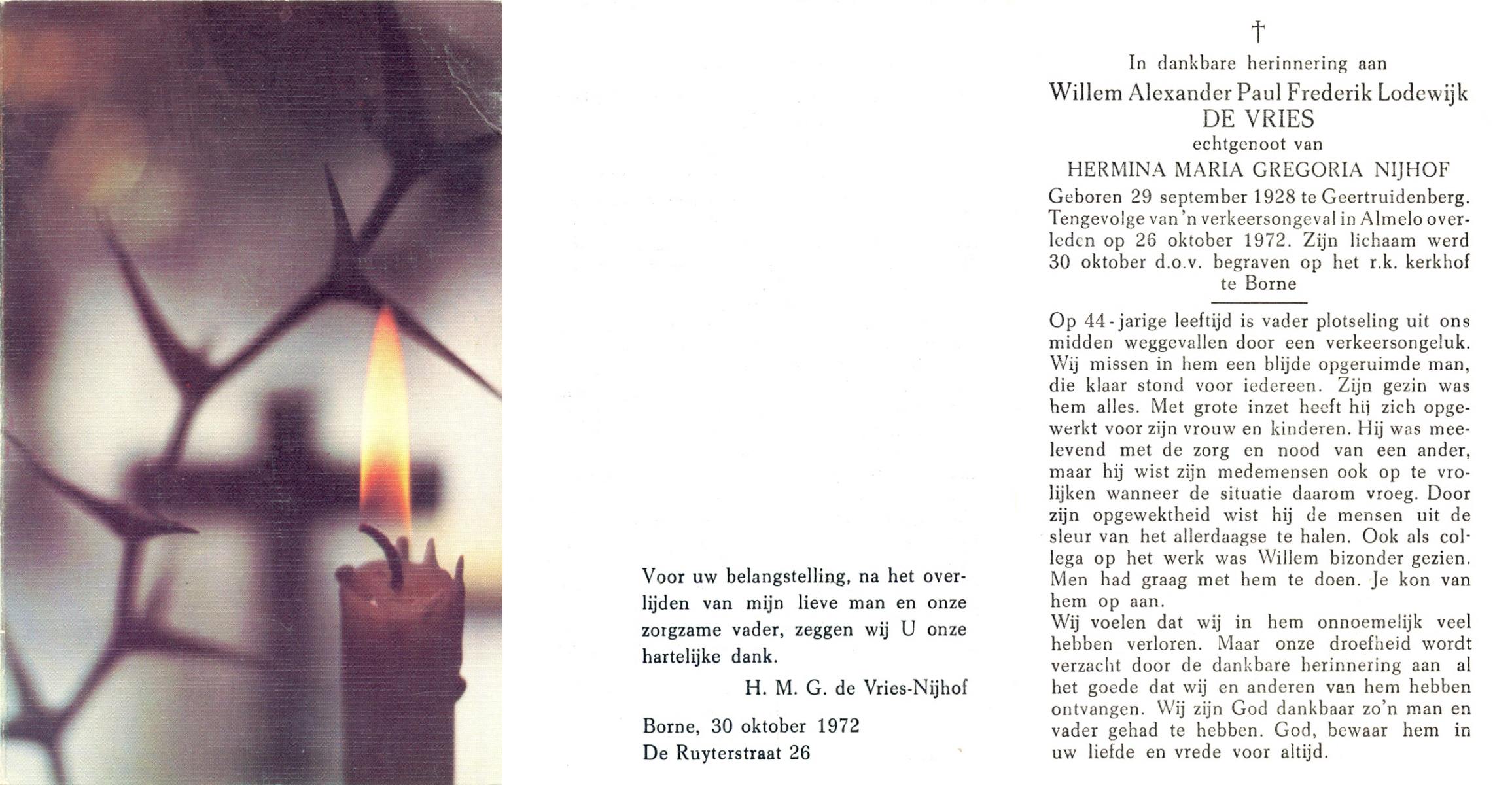 VRIES, de, Willem Alexander Paul Frederik, geboren op 29-9-1928 te Geertruidenberg, overleden op 26-10-1972 te Almelo op 44-jarige leeftijd, begraven op 30-10-1972 te Borne.