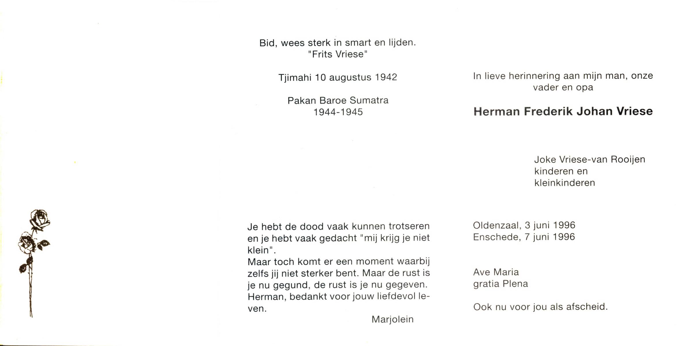 VRIESE, Herman Frederik Johan, geboren op 10-8-1942 te Tjimahi, overleden op 3-6-1996 te Oldenzaal op 53-jarige leeftijd.