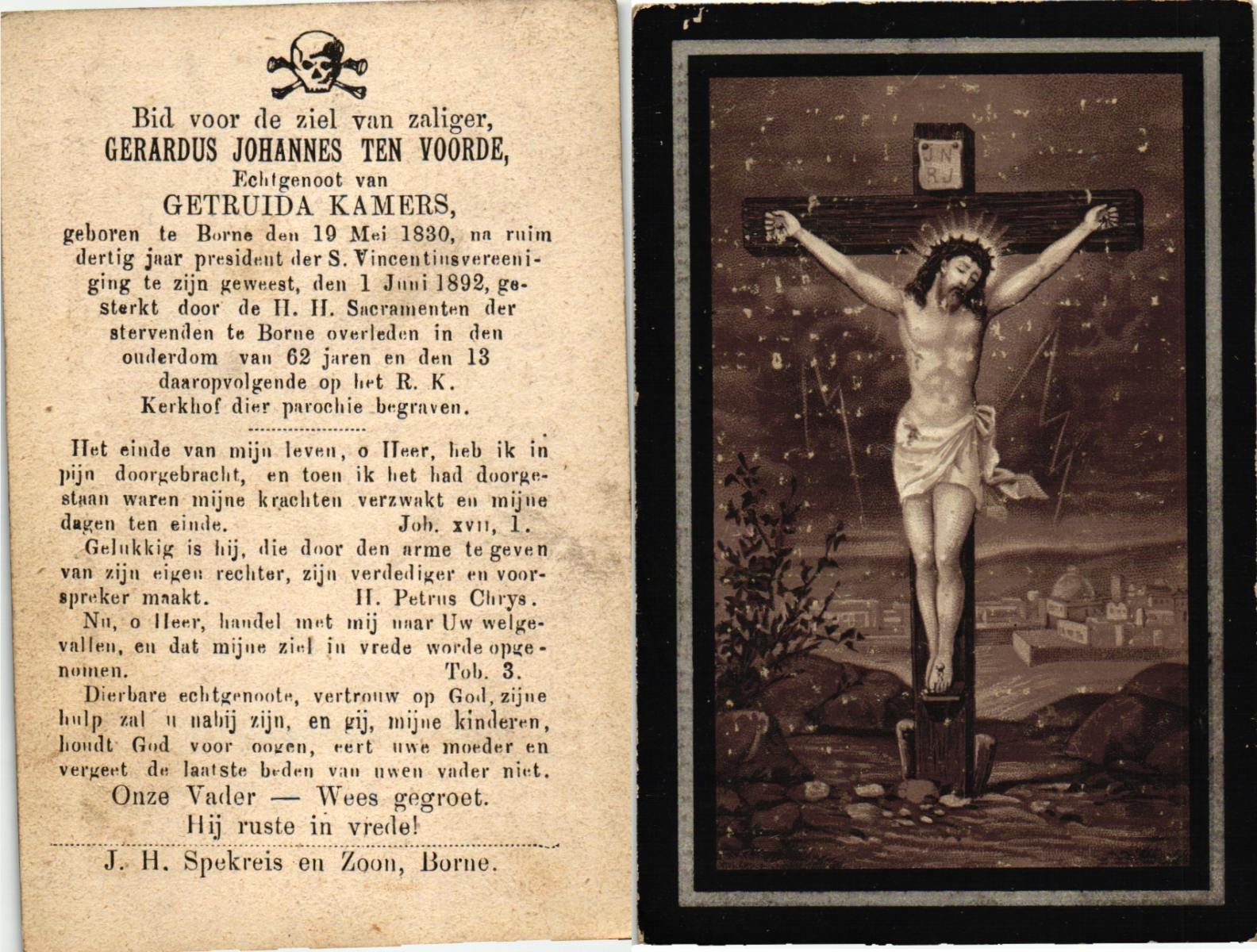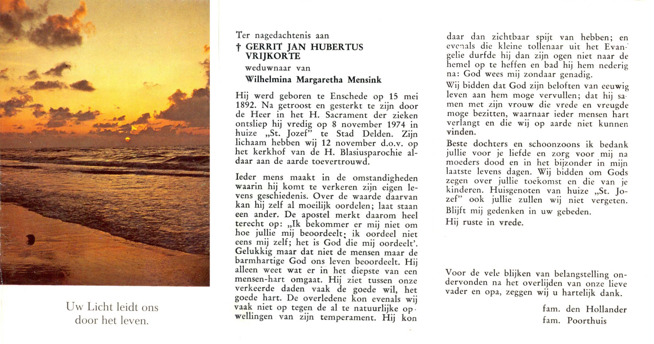 VRIJKORTE, Gerrit Jan Hubertus, geboren op 15-05-1892 te Enschede, overleden op 8-11-1974 te Delden, Stad op 82-jarige leeftijd, begraven op 12-11-1974 te Delden.