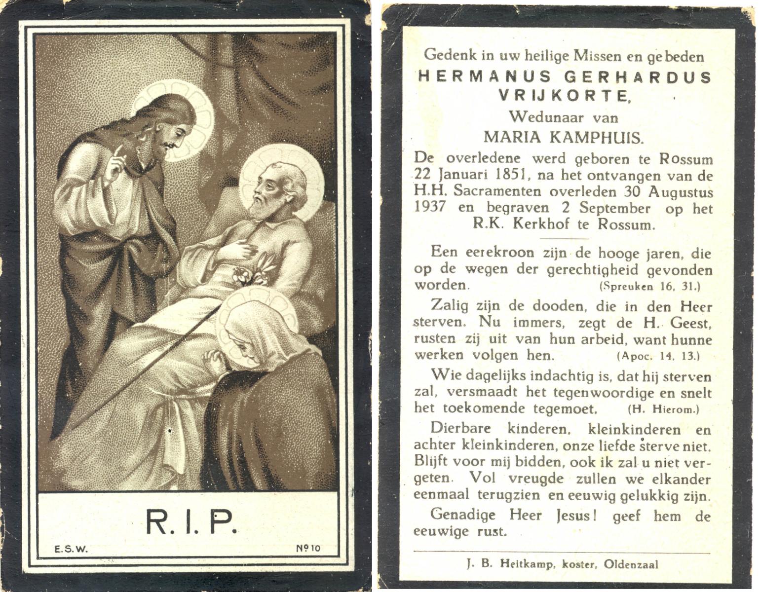 VRIJKORTE, Hermanus Gerhardus, geboren op 22-01-1851 te Rossum, overleden op 30-8-1937 op 86-jarige leeftijd, begraven op 2-9-1937 te Rossum.