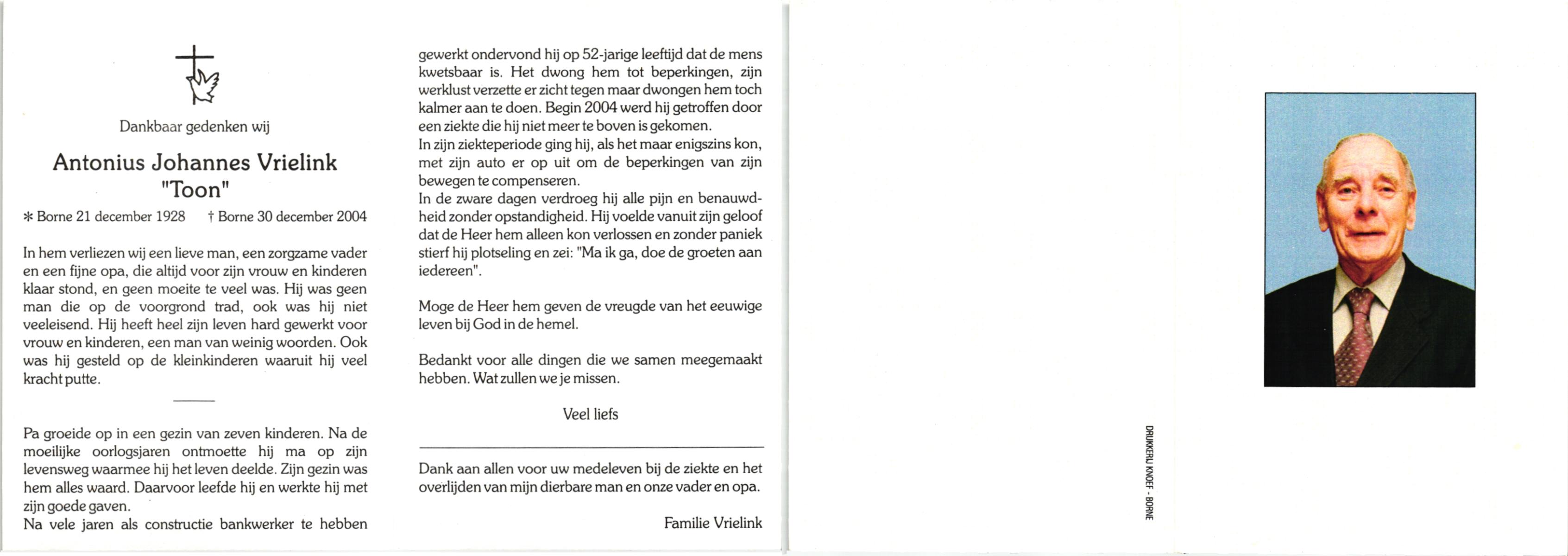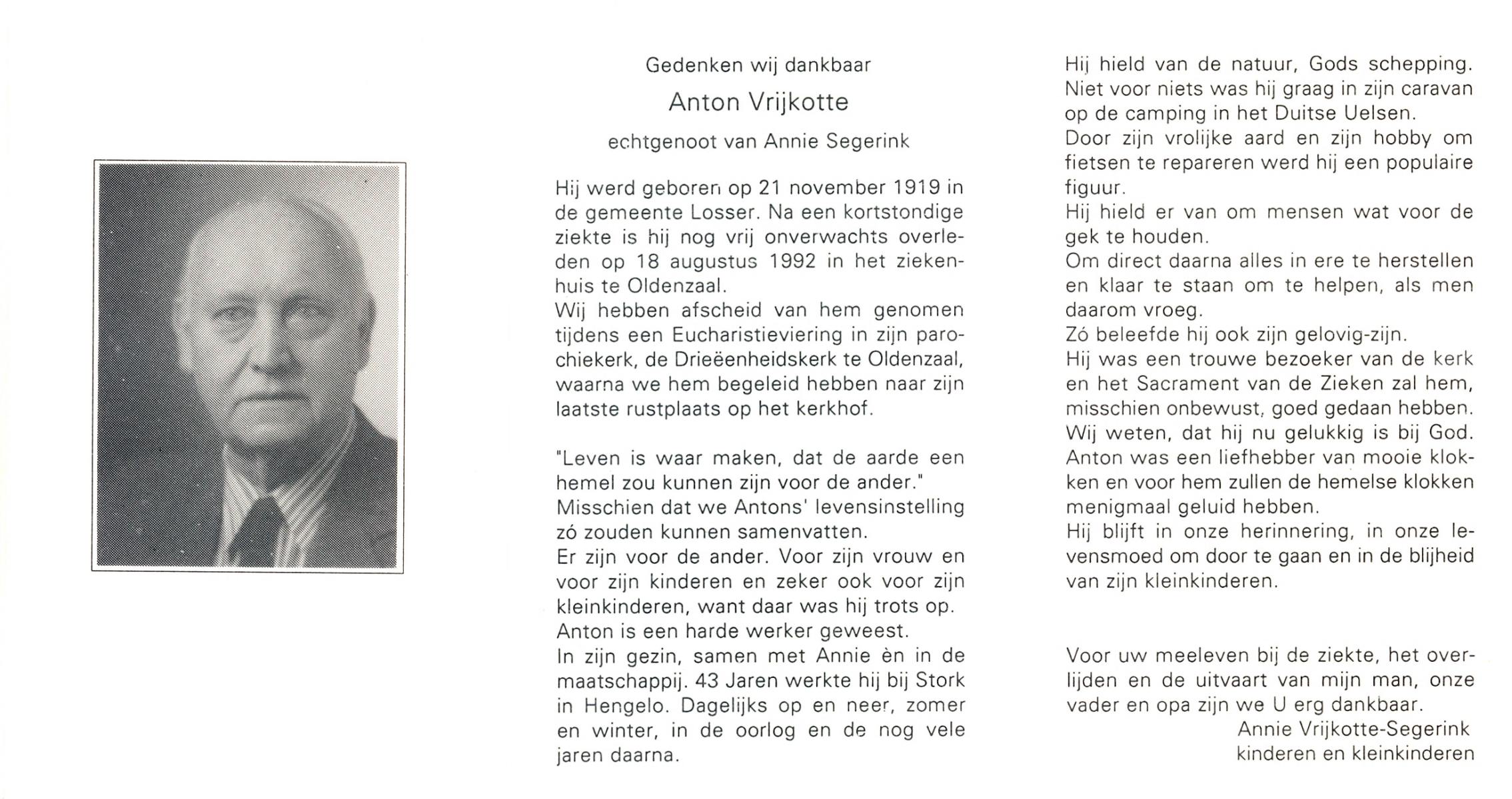VRIJKOTTE, Anton, geboren op 21-11-1919 te Losser, overleden op 18-8-1992 te Oldenzaal op 72-jarige leeftijd, begraven te Oldenzaal.