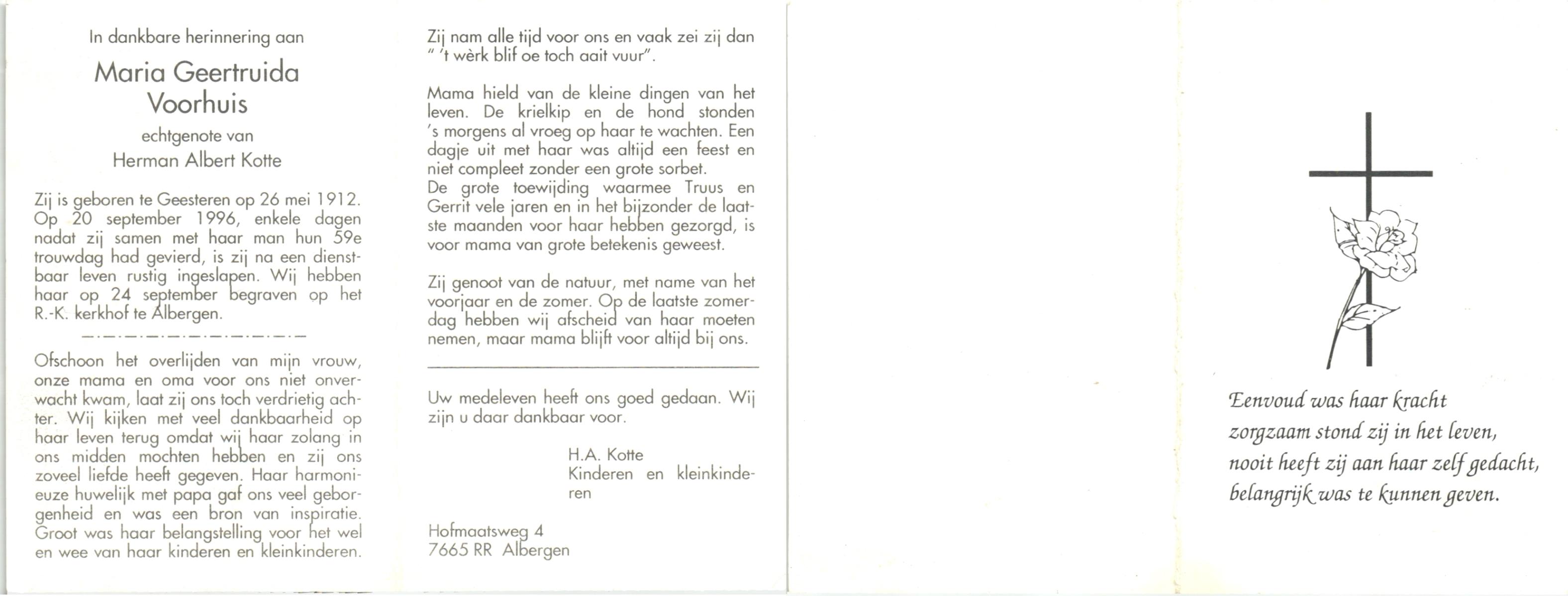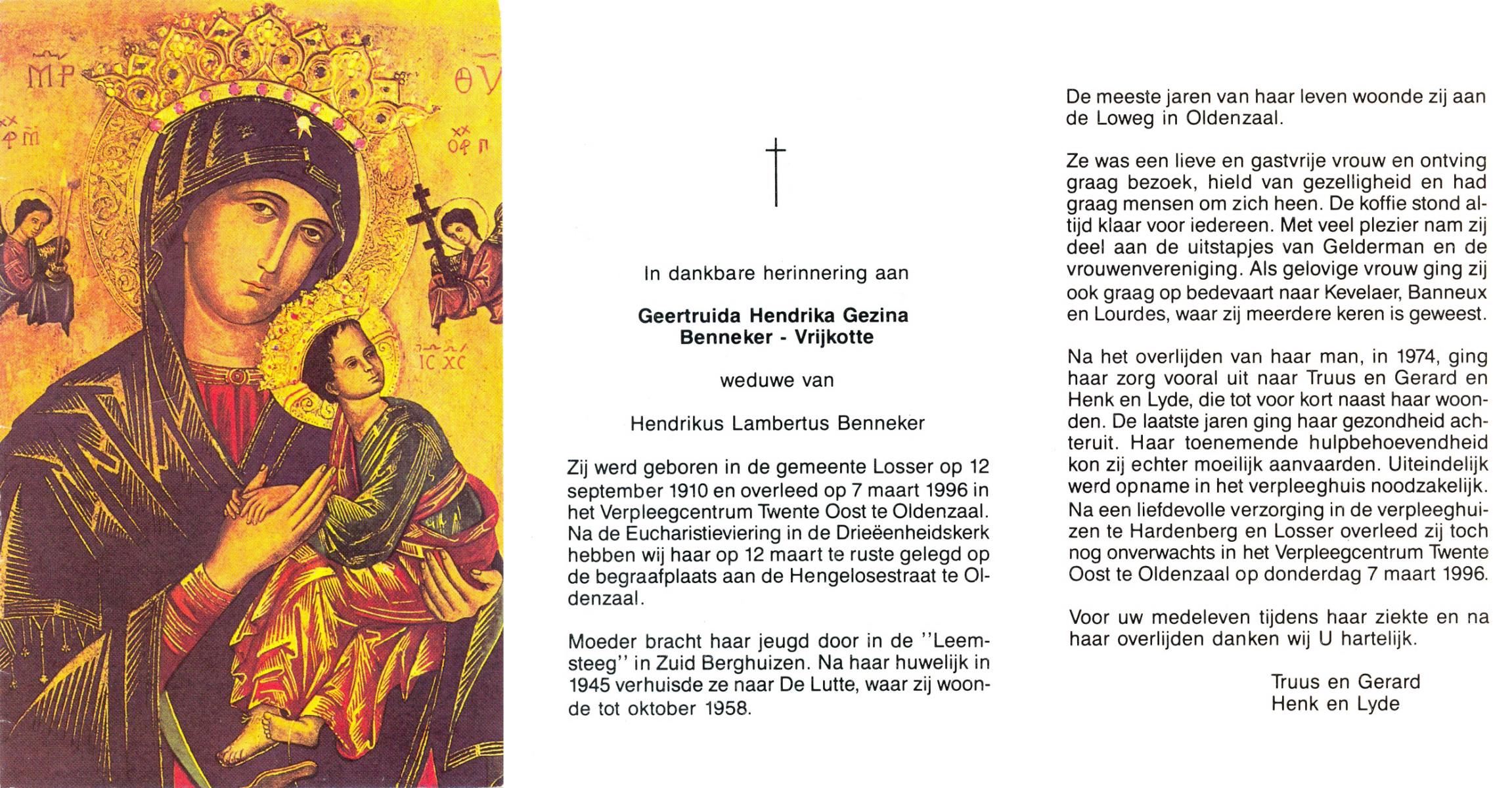 VRIJKOTTE, Geertruida Hendrika, geboren op 12-9-1910 te Losser, overleden op 7-3-1996 te Oldenzaal op 85-jarige leeftijd, begraven op 12-3-1996 te Oldenzaal.