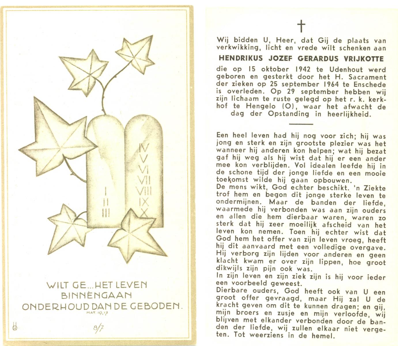 VRIJKOTTE, Hendrikus Jozef Gerardus, geboren op 15-10-1942 te Udenhout, overleden op 25-9-1964 te Enschede op 21-jarige leeftijd, begraven op 29-9-1964 te Hengelo (Ov.).