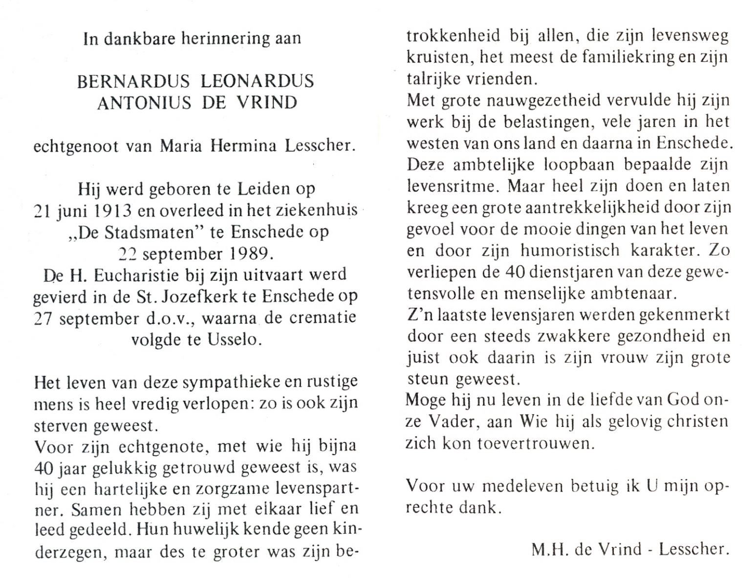 VRIND, de, Bernardus Leonardus Antonius, geboren op 21-6-1913 te Leiden, overleden op 22-9-1989 te Enschede op 76-jarige leeftijd, gecremeerd op 27-9-1989 te Usselo.