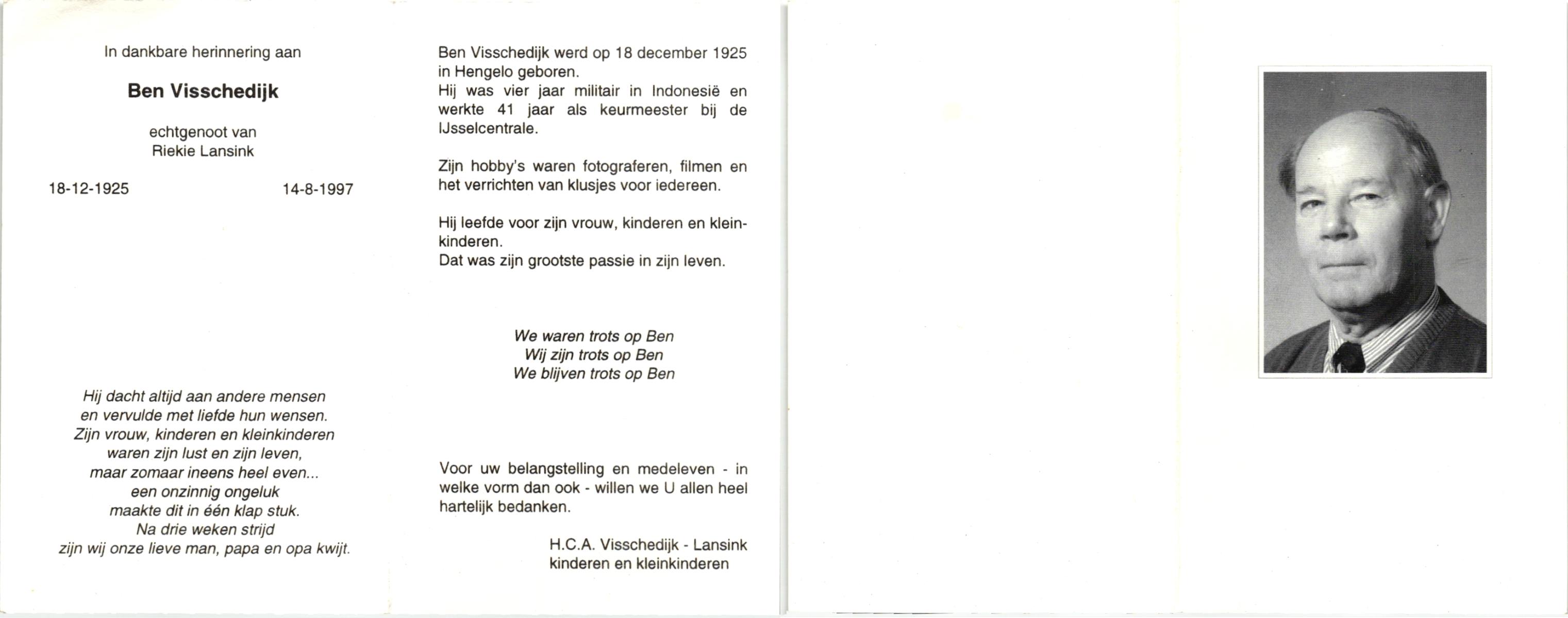VISSCHEDIJK, , Ben, geboren op 18-12-1925, overleden op 14-8-1997 op 71-jarige leeftijd.