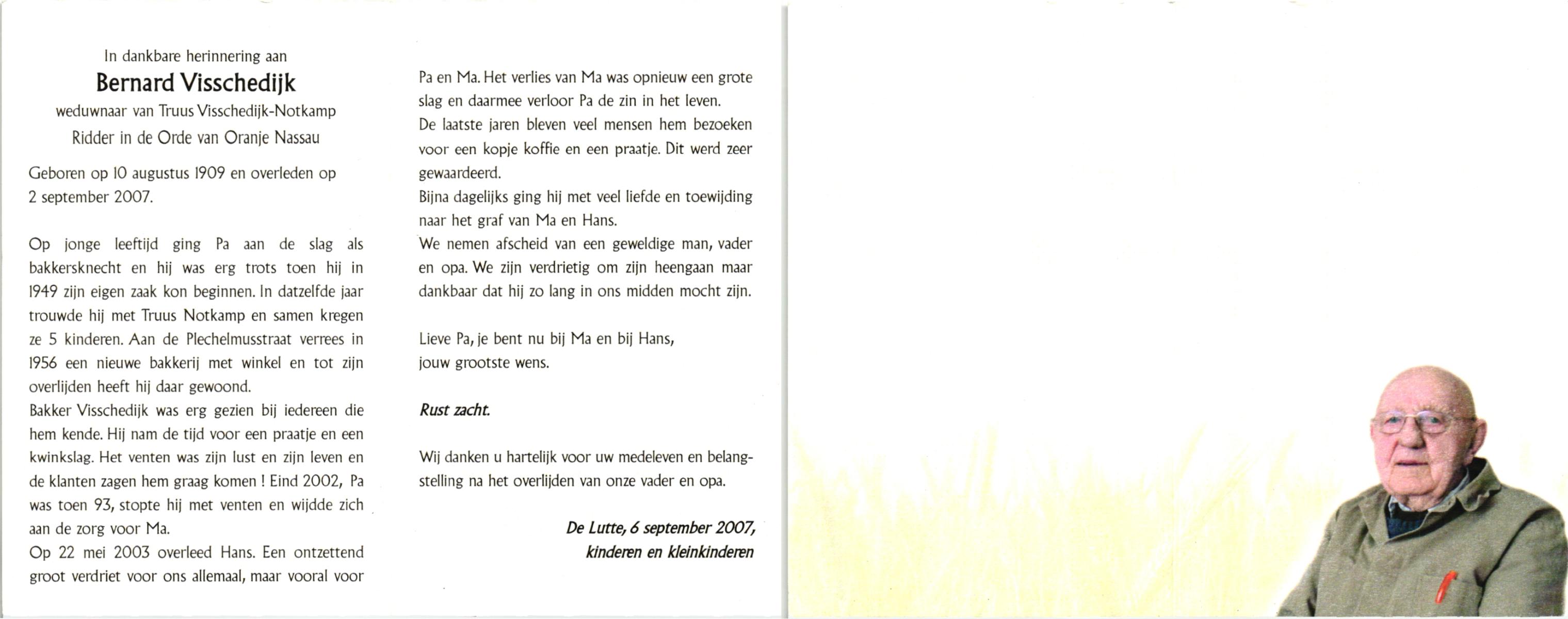 VISSCHEDIJK, , Bernard, geboren op 10-8-1909, overleden op 2-9-2007 op 98-jarige leeftijd.