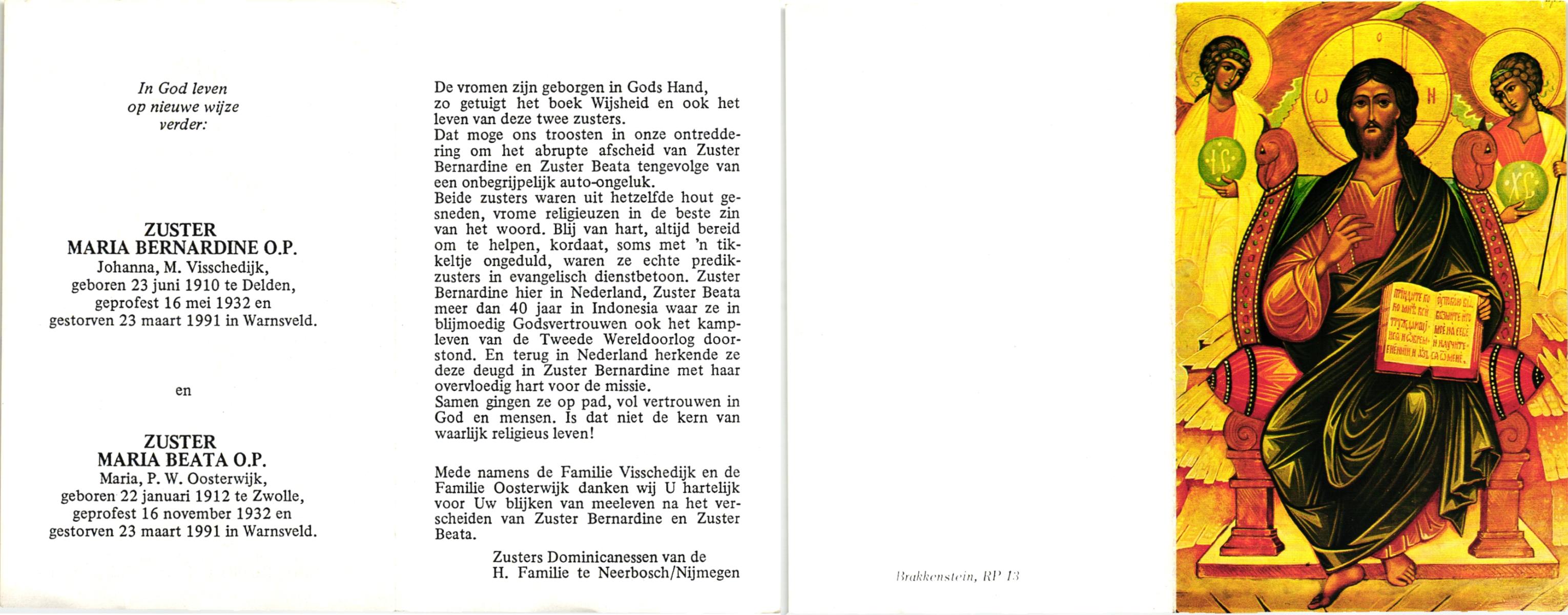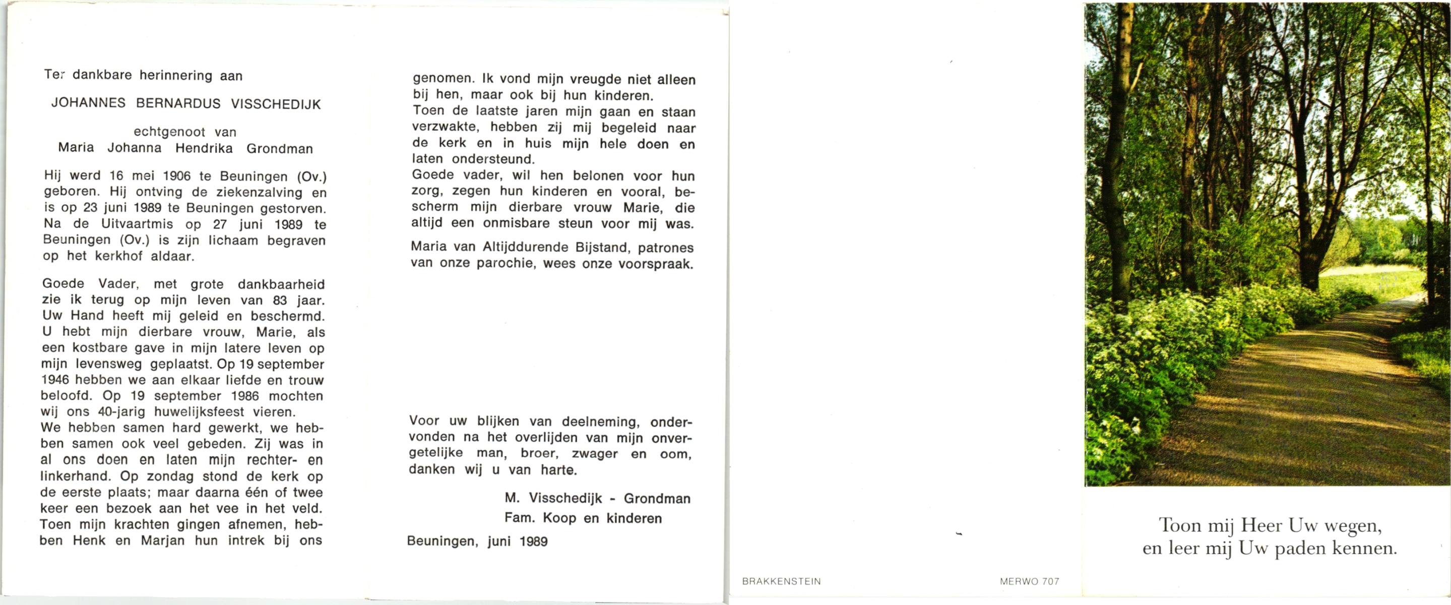 VISSCHEDIJK, , Johannes Bernardus, geboren op 16-5-1906 te Deurningen, overleden op 23-6-1989 te Beuningen op 83-jarige leeftijd, begraven op 27-6-1989 te Beuningen.