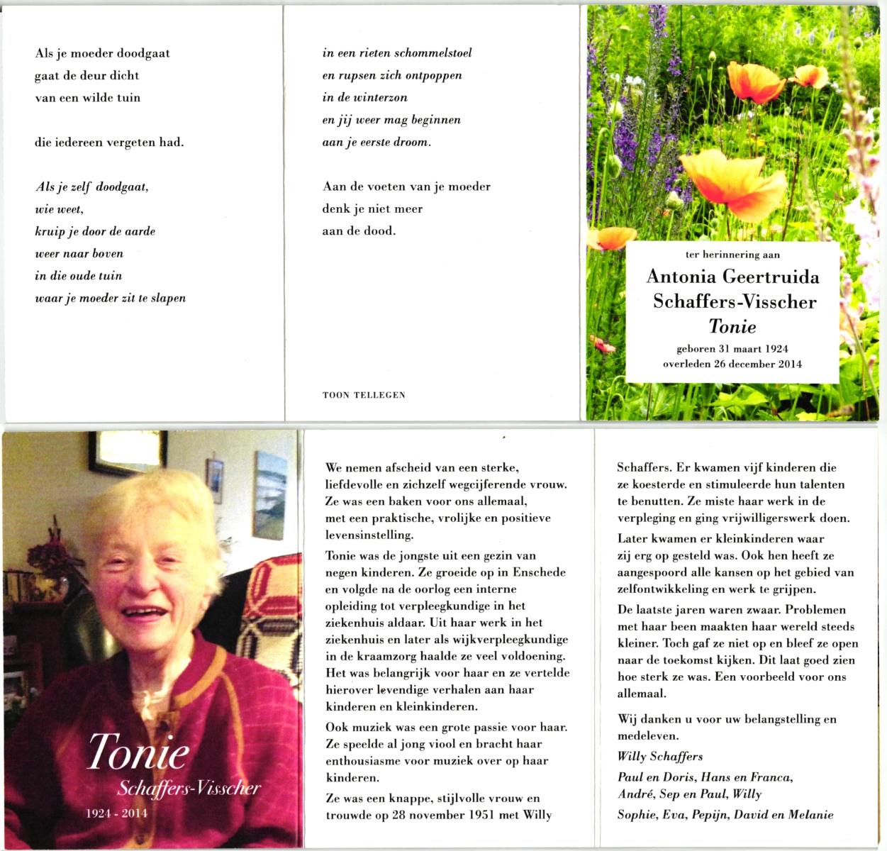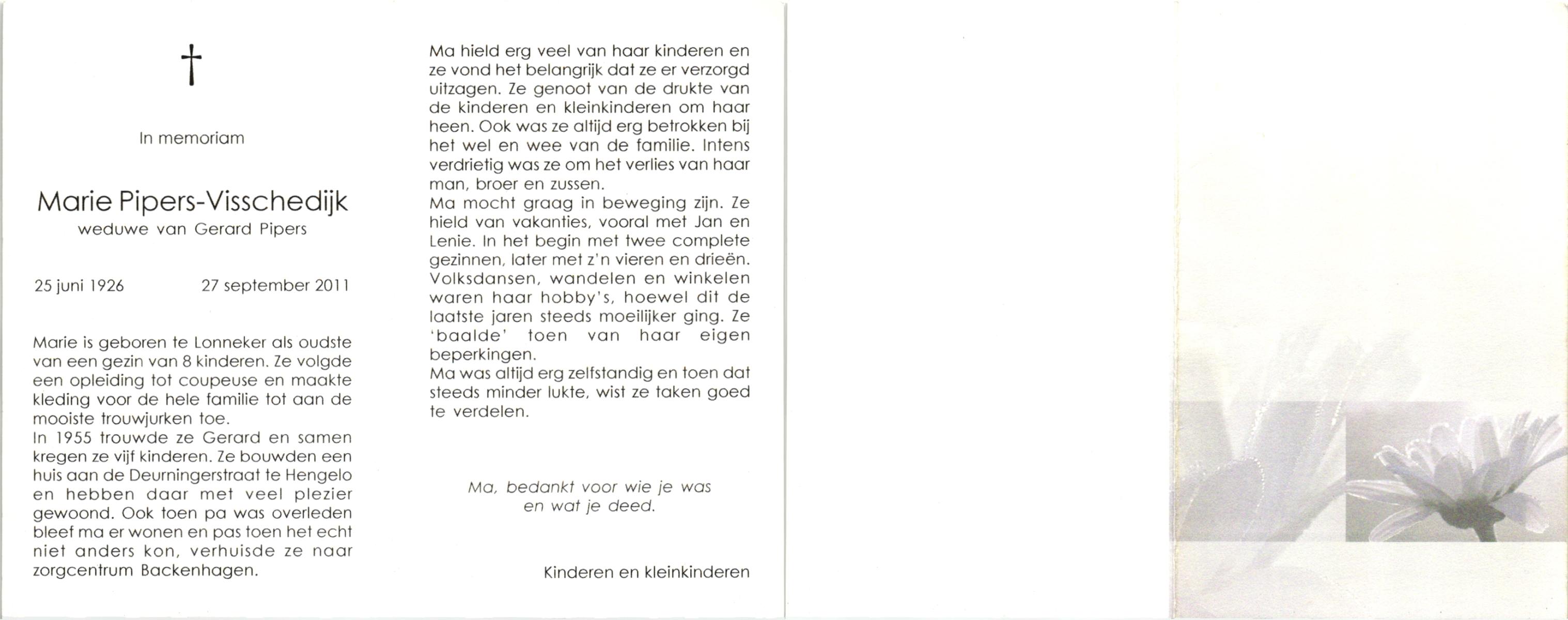 VISSCHEDIJK, , Marie, geboren op 25-6-1926 te Lonneker, overleden op 27-9-2011 te Hengelo (O) op 85-jarige leeftijd.