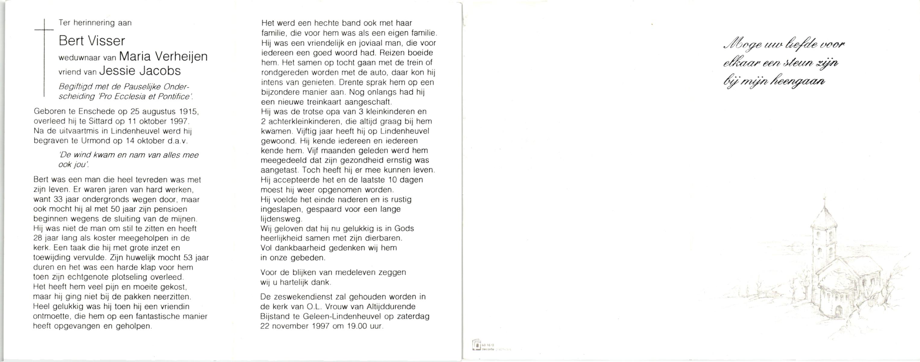 VISSER, , Bert, geboren op 25-8-1915 te Enschede, overleden op 11-10-1997 te Sittard op 82-jarige leeftijd, begraven op 14-10-1997 te Urmond.
