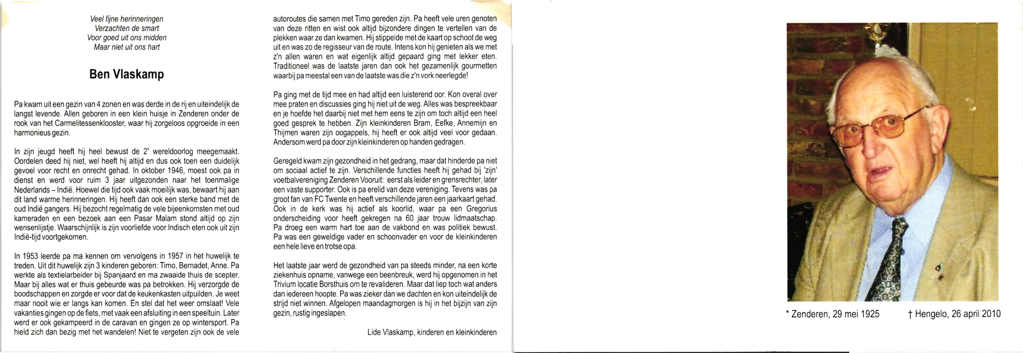 VLASKAMP, , Ben, geboren op 29-5-1925 te Zenderen, overleden op 26-4-2010 te Hengelo (O) op 84-jarige leeftijd.