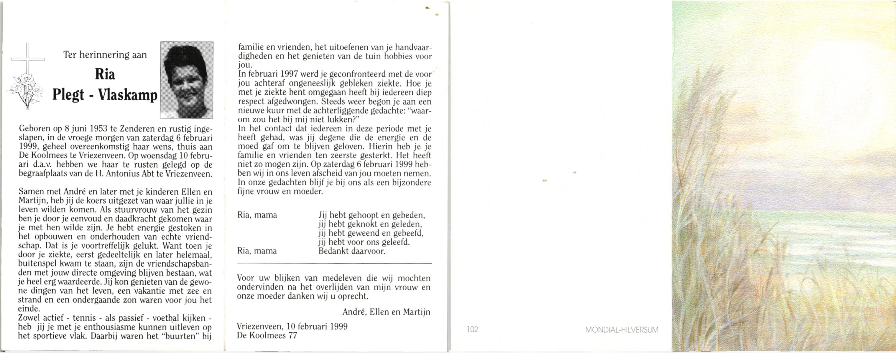 VLASKAMP, , Ria, geboren op 8-6-1953 te Zenderen, overleden op 6-2-1999 te Vriezenveen op 45-jarige leeftijd, begraven op 10-2-1999 te Vriezenveen.