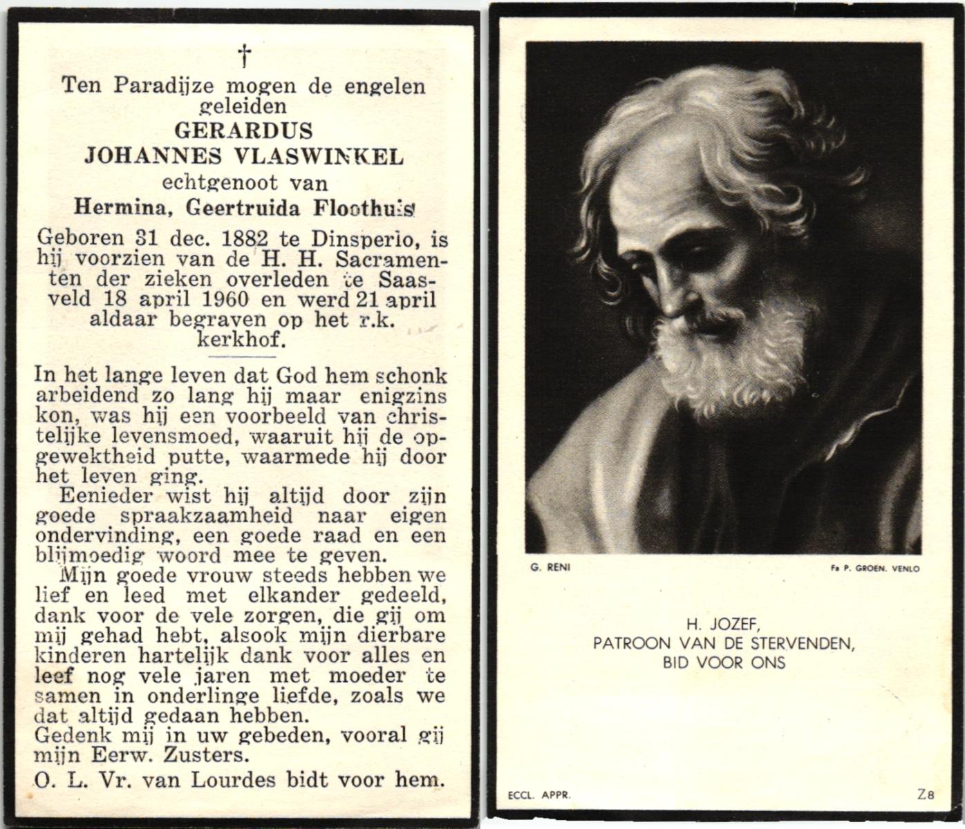 VLASWINKEL, , Gerardus Johannes, geboren op 31-12-1882 te Dinxperlo, overleden op 18-4-1960 te Saasveld op 77-jarige leeftijd, begraven op 21-4-1960 te Saasveld.