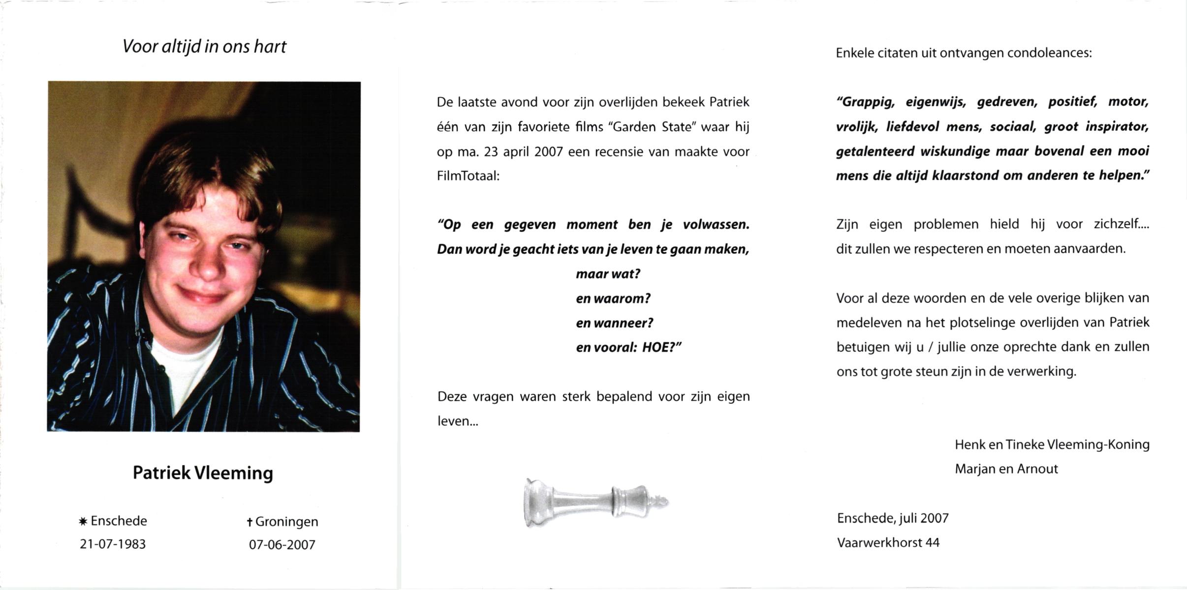 VLEEMING, , Patriek, geboren op 21-7-1983 te Enschede, overleden op 7-6-2007 te Groningen op 23-jarige leeftijd.