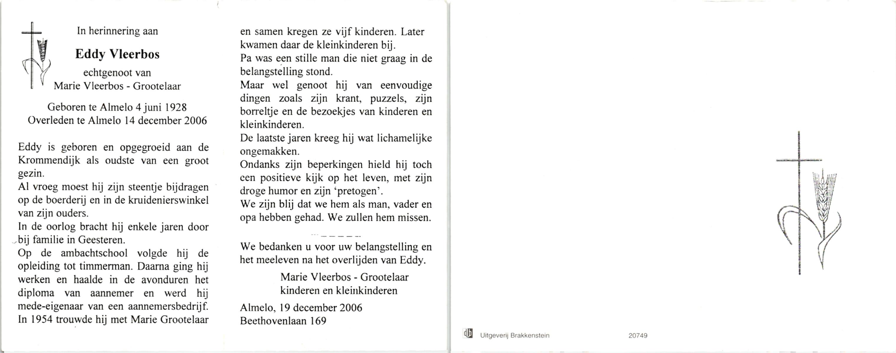 VLEERBOS, , Eddy, geboren op 4-6-1928 te Almelo, overleden op 14-12-2006 te Almelo op 78-jarige leeftijd.