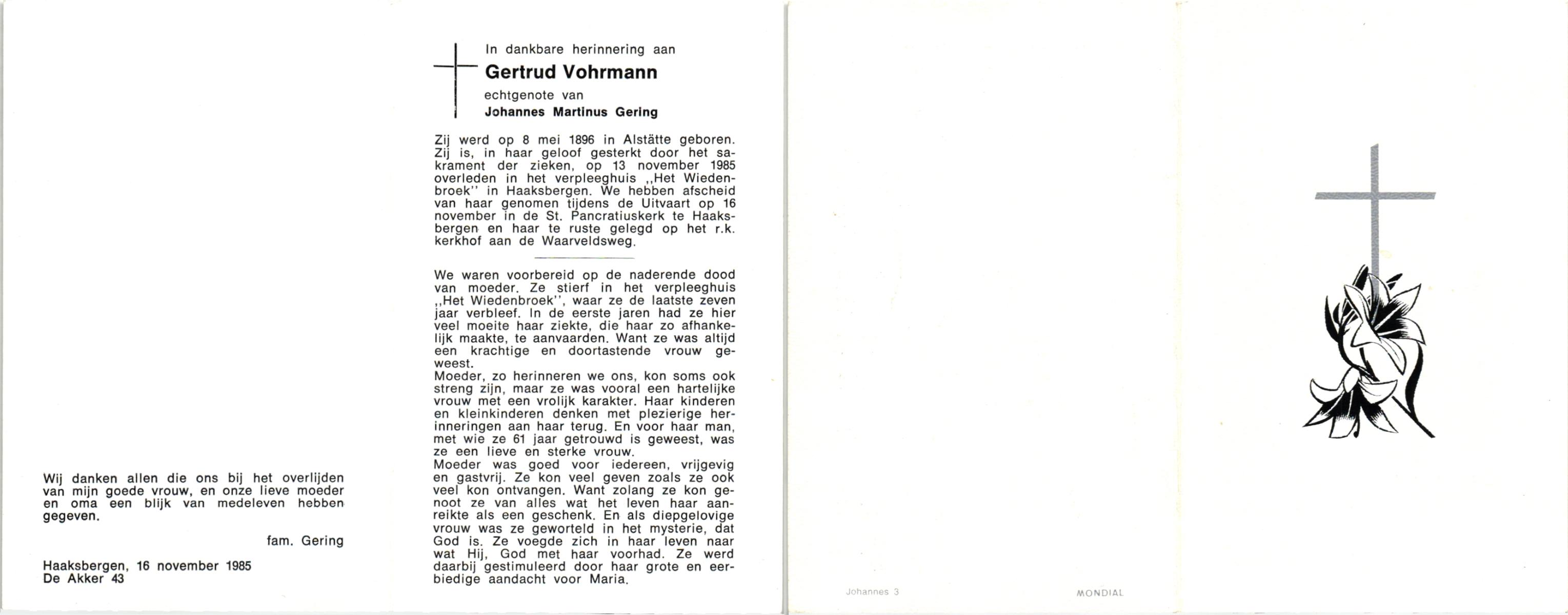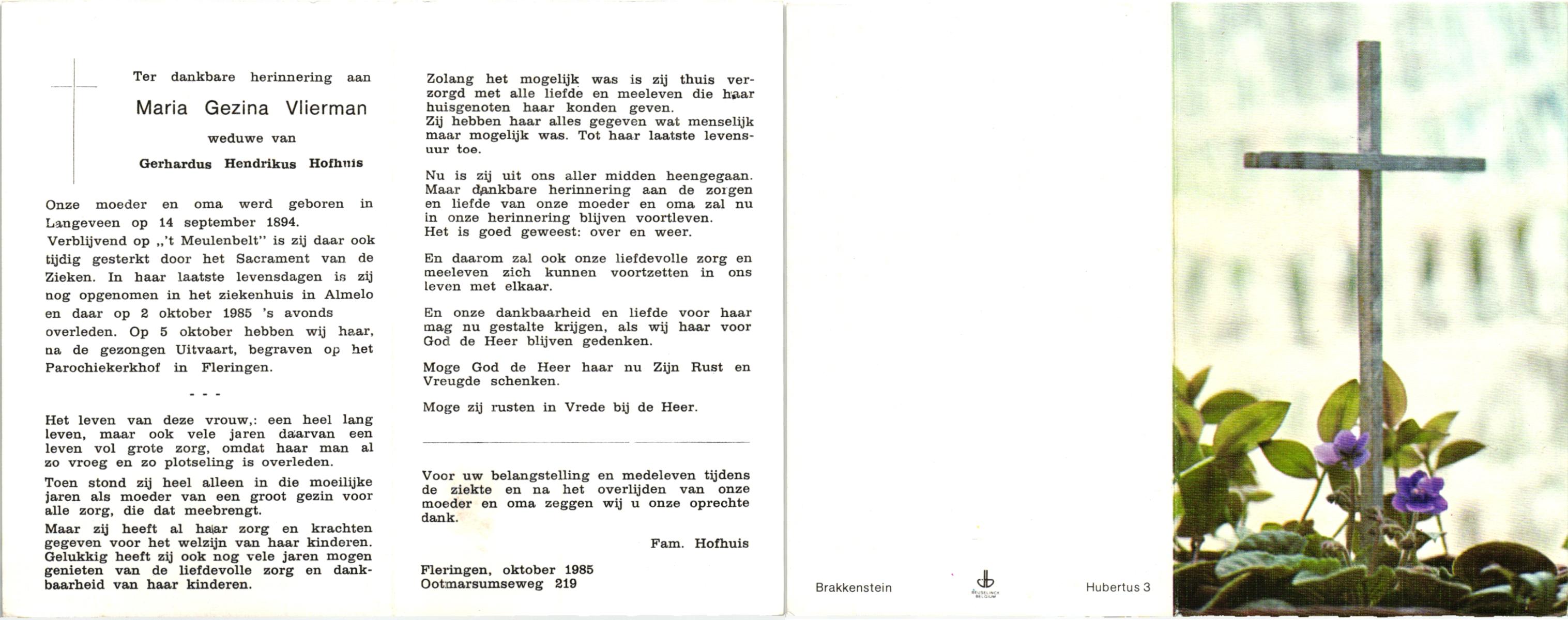 VLIERMAN, , Maria Gezina, geboren op 14-09-1894 te Langeveen, overleden op 2-10-1985 te Almelo op 91-jarige leeftijd, begraven op 5-10-1985 te Fleringen.