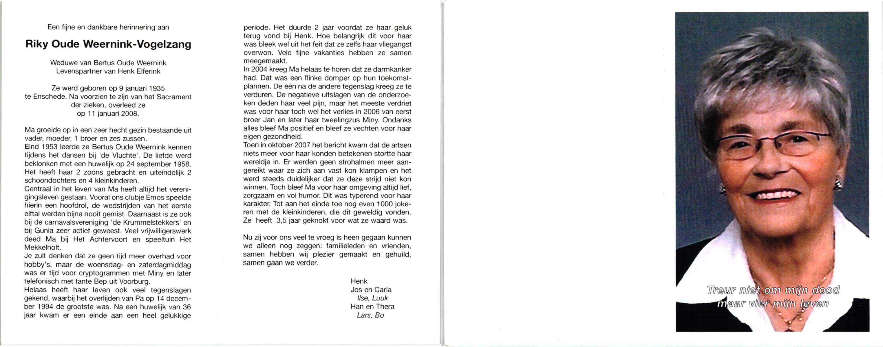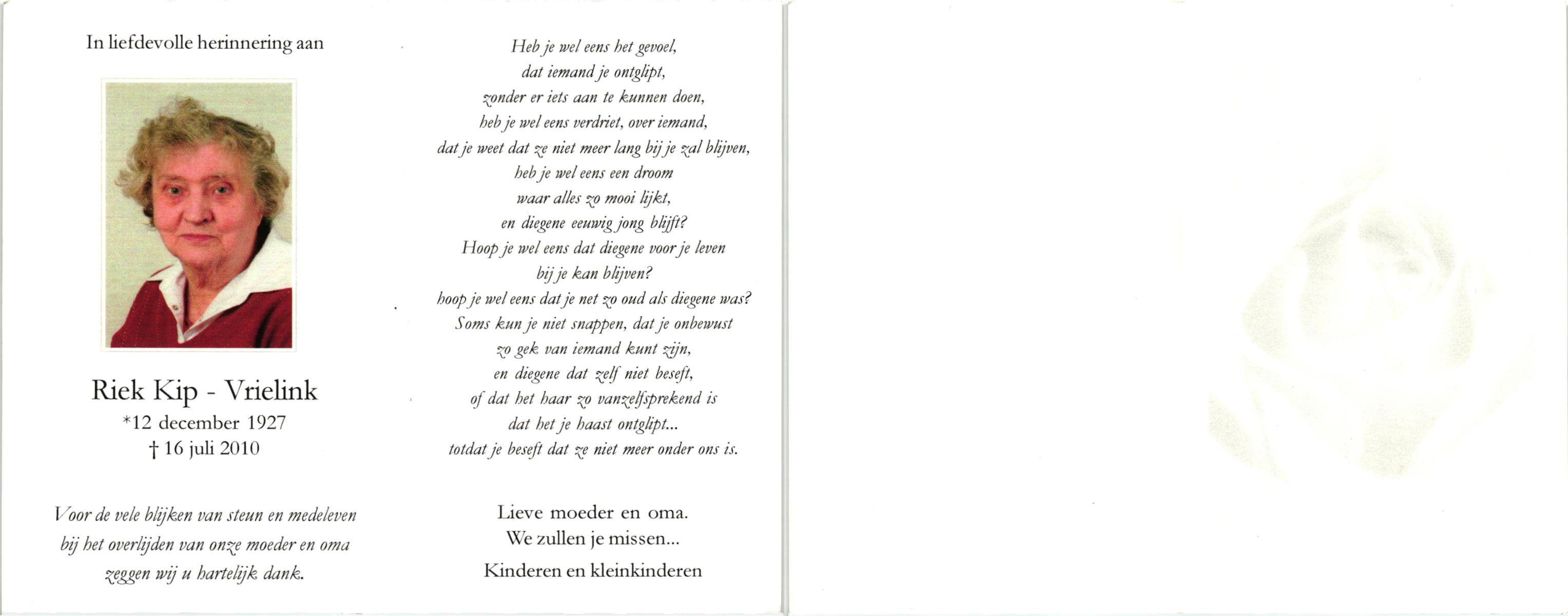 VRIELINK, , Riek, geboren op 12-12-1927, overleden op 16-7-2010 op 82-jarige leeftijd.