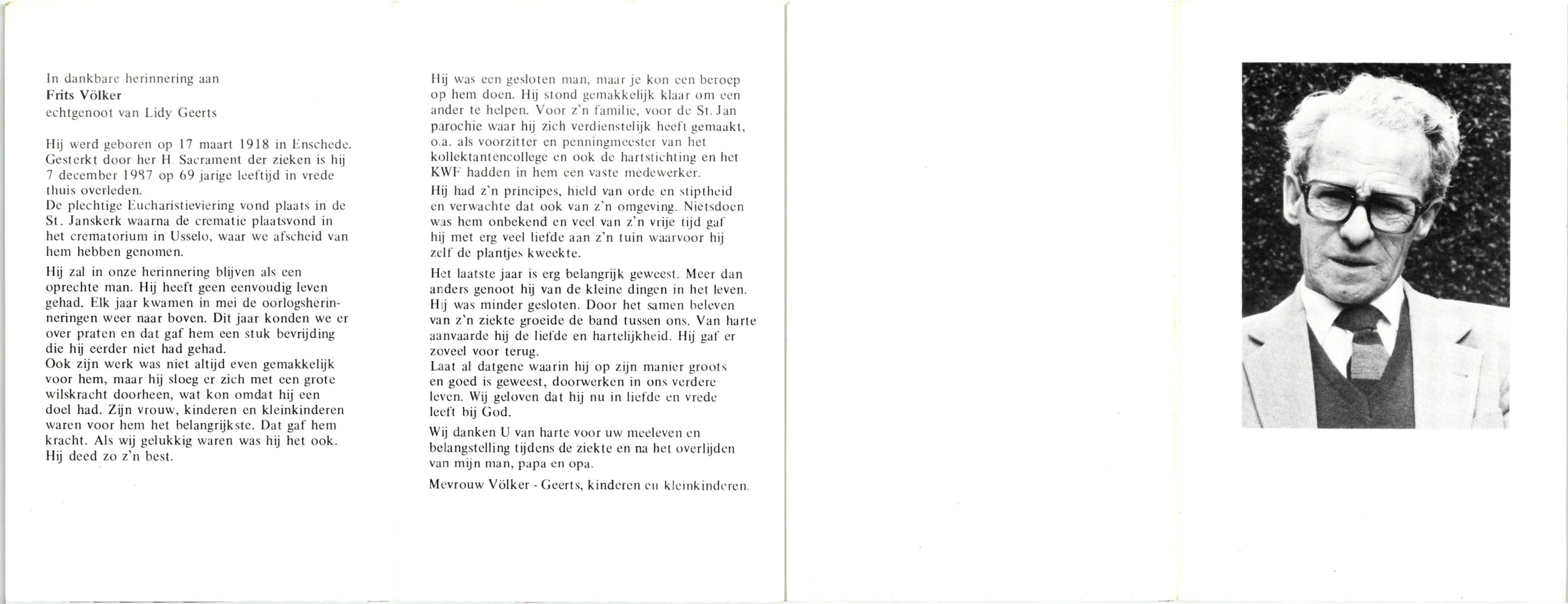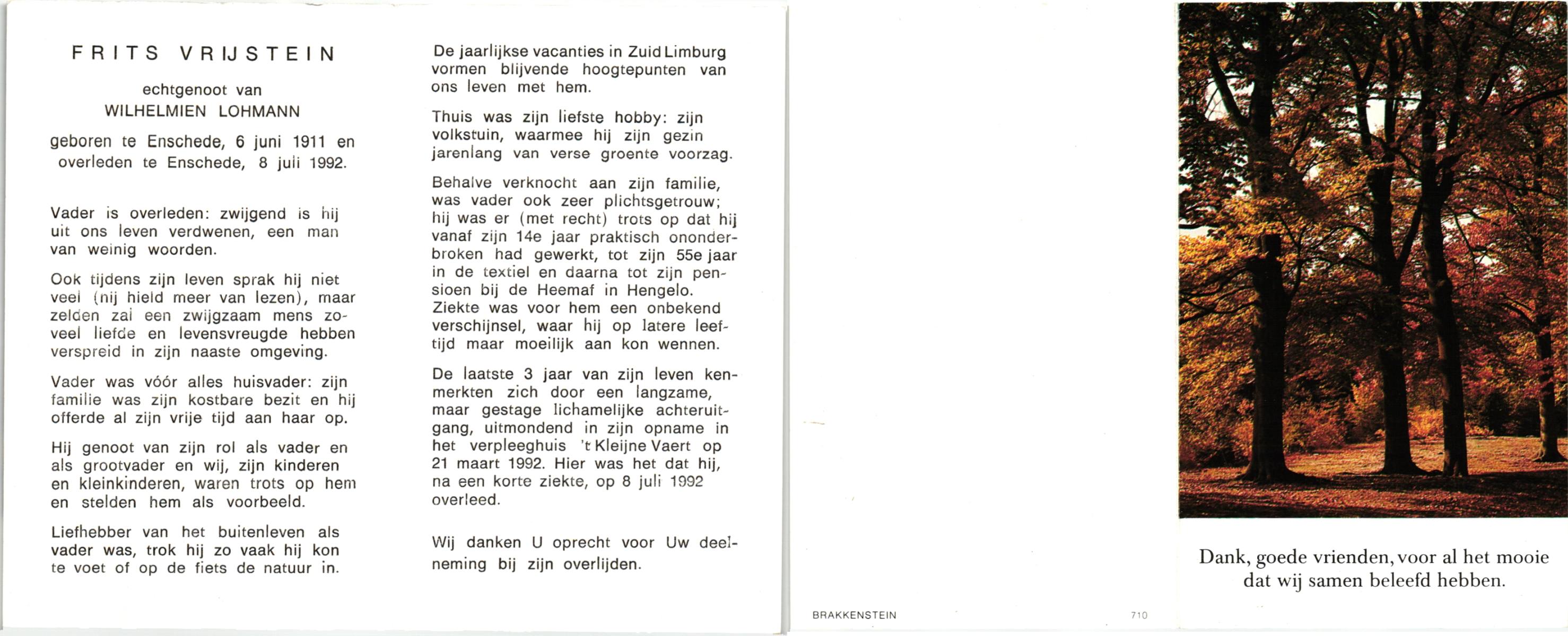 VRIJSTEIN, , Frits, geboren op 6-6-1911 te Enschede, overleden op 8-7-1992 te Enschede op 81-jarige leeftijd.