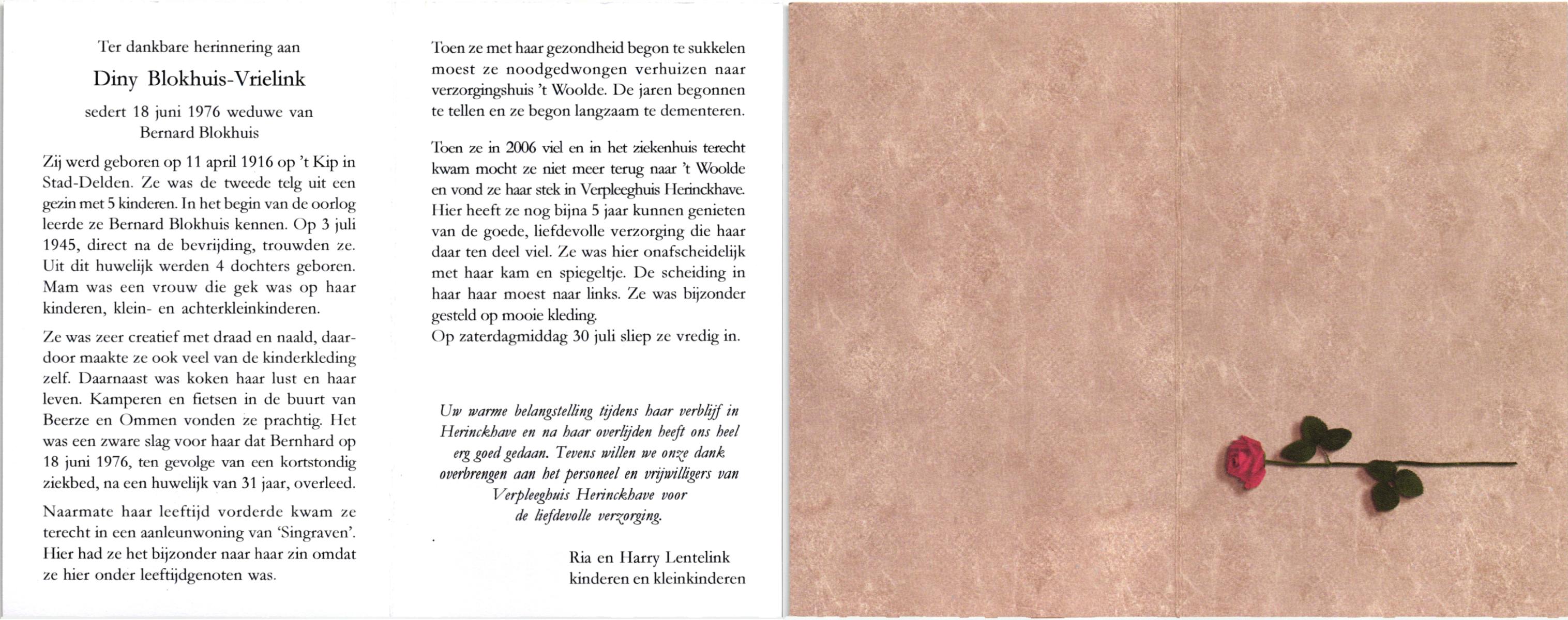 VRIELINK, , Diny, geboren op 11-4-1916 te Delden, Stad, overleden op 30-7-2011 op 95-jarige leeftijd.