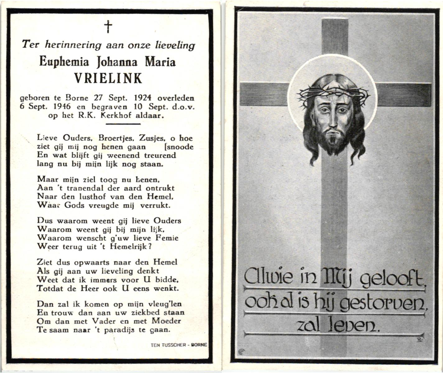VRIELINK, , Euphemia Johanna Maria, geboren op 27-9-1924 te Borne, overleden op 6-9-1946 te Borne op 21-jarige leeftijd, begraven op 10-9-1946 te Borne.