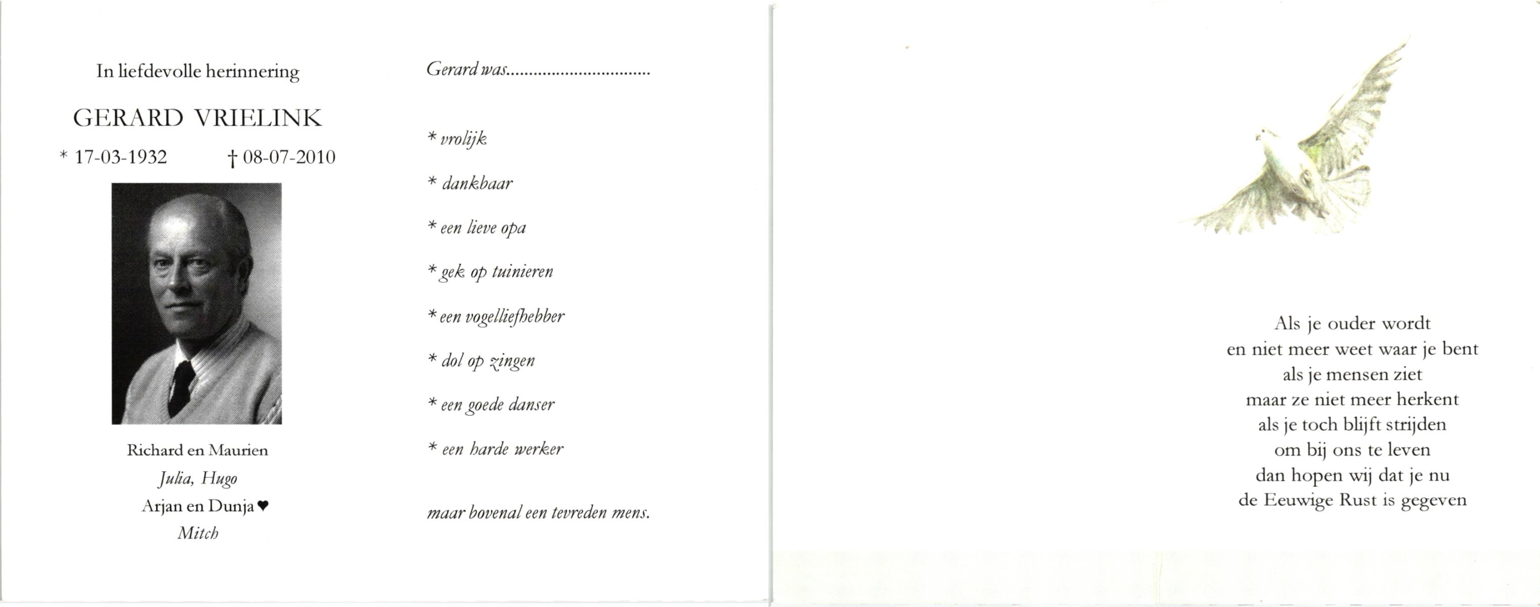 VRIELINK, , Gerard, geboren op 17-3-1932, overleden op 8-7-2010 op 78-jarige leeftijd.