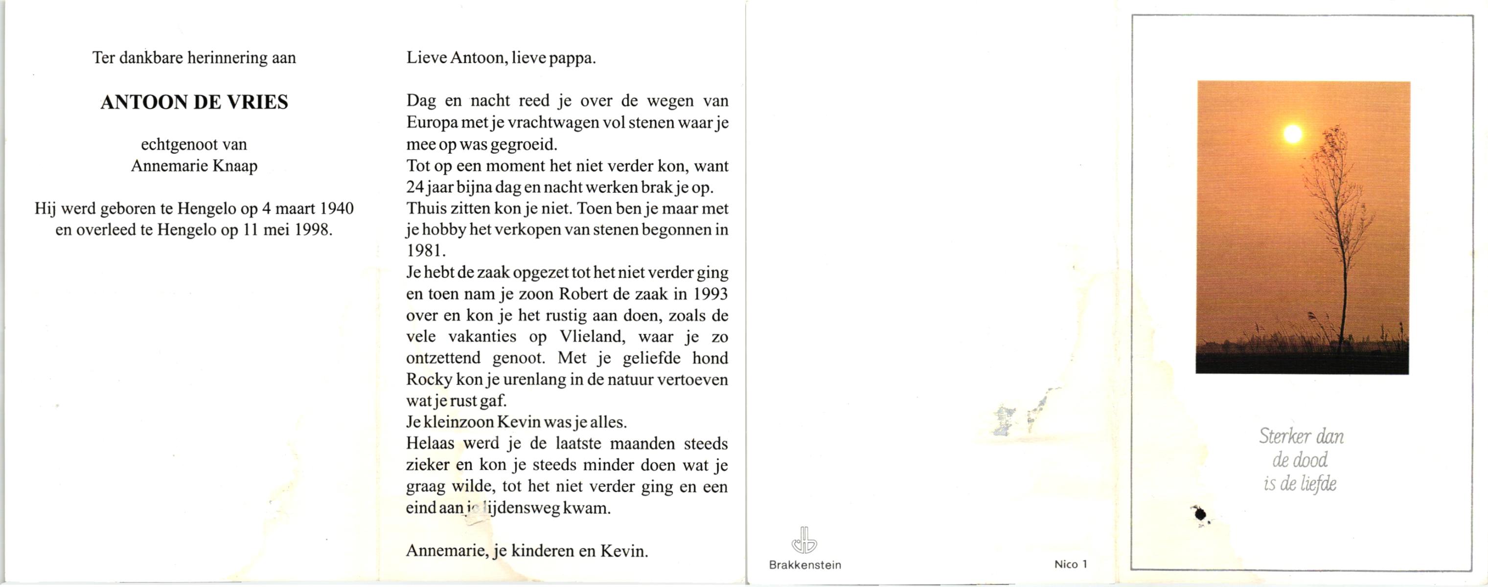 VRIES, de, Antoon, geboren op 4-3-1940 te Hengelo (O), overleden op 11-5-1998 te Hengelo (O) op 58-jarige leeftijd.