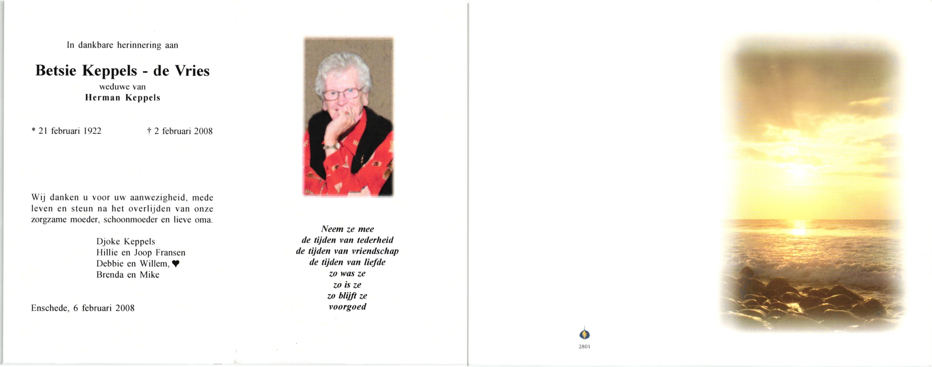 VRIES, de, Betsie, geboren op 21-2-1922, overleden op 2-2-2008 op 85-jarige leeftijd.
