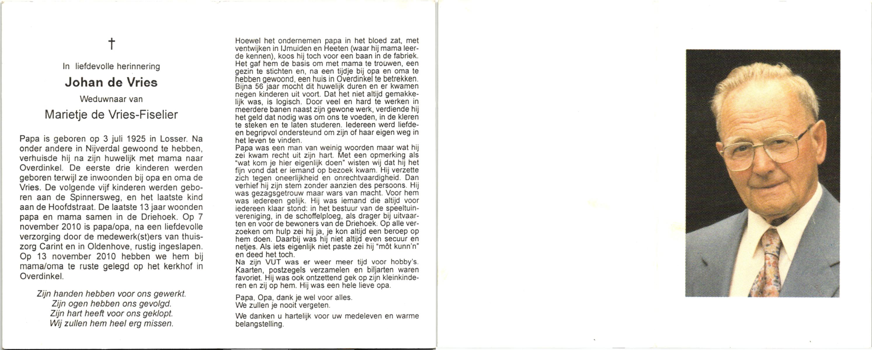 VRIES, de, Johan, geboren op 3-7-1925 te Losser, overleden op 7-11-2010 te Losser op 85-jarige leeftijd, begraven op 13-11-2010 te Overdinkel.
