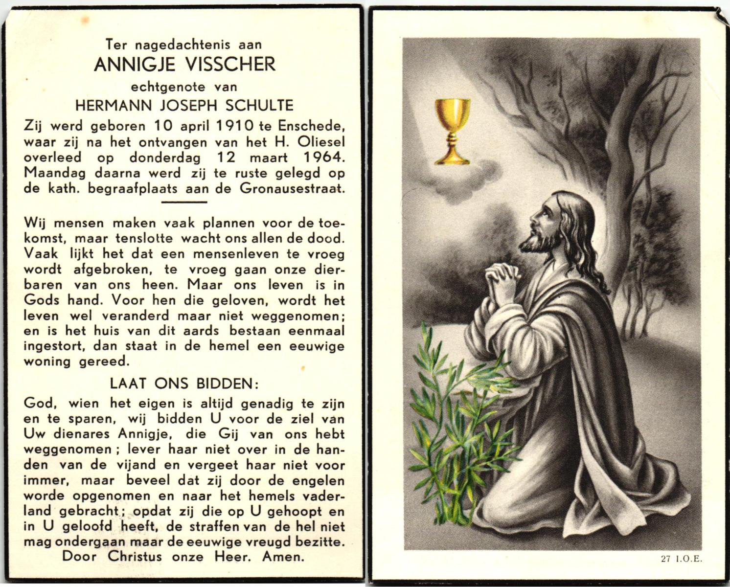 VISSCHER, Annigje, geboren op 10-4-1910 te Enschede, overleden op 12-3-1964 te Enschede op 53-jarige leeftijd, begraven te Enschede.