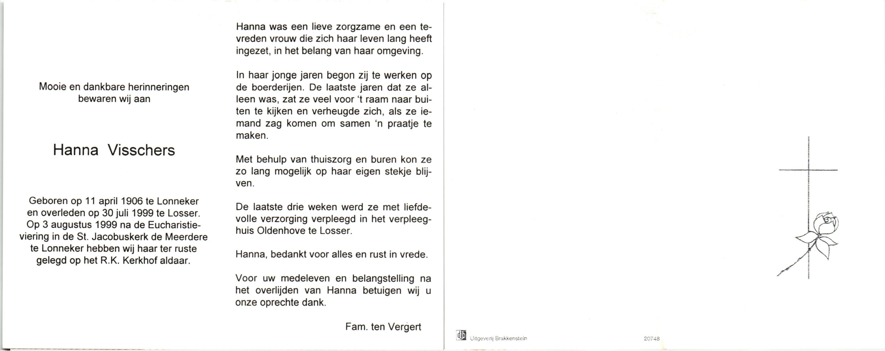 VISSCHERS, Hanna, geboren op 11-4-1906 te Lonneker, overleden op 30-7-1999 te Losser op 93-jarige leeftijd, begraven op 3-8-1999 te Losser.