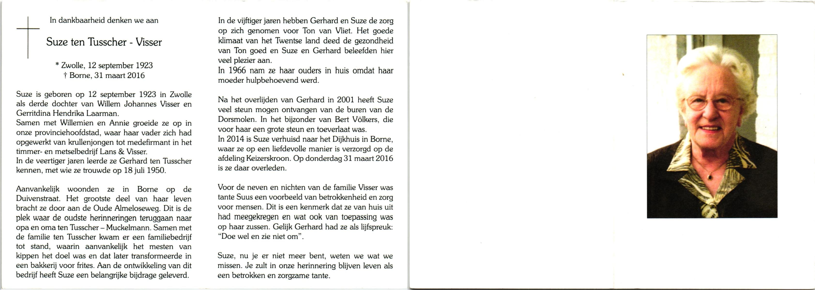 VISSER, Suze, geboren op 12-9-1923 te Zwolle, overleden op 31-3-2016 te Borne op 92-jarige leeftijd.