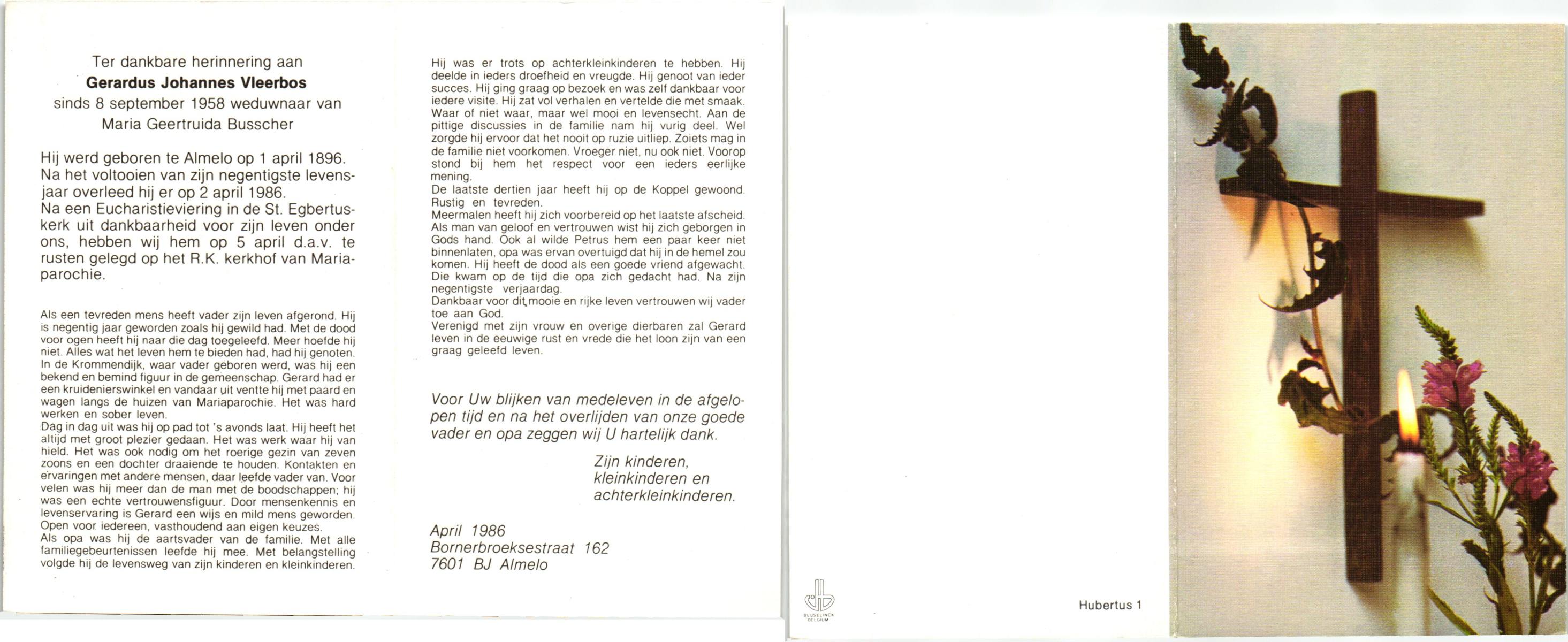 VLEERBOS, Gerardus Johannes, geboren op 01-04-1896 te Almelo, overleden op 2-4-1986 op 90-jarige leeftijd, begraven op 5-4-1986 te Mariaparochie.