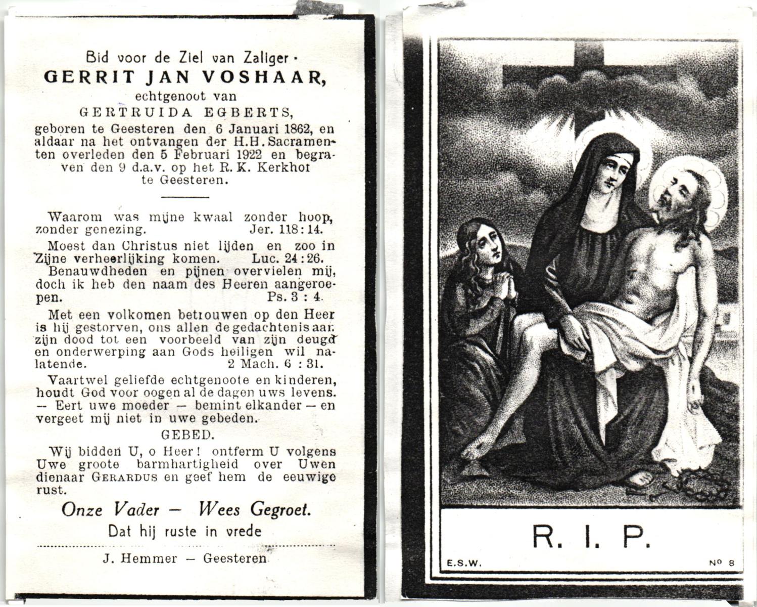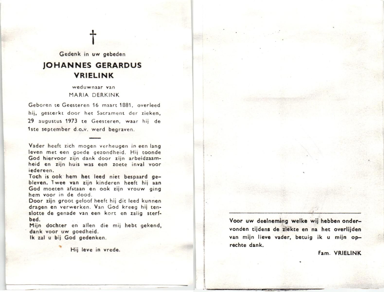 VRIELINK, Johannes Gerardus, geboren op 16-03-1881 te Geesteren, overleden op 29-8-1973 te Geesteren op 92-jarige leeftijd, begraven op 1-9-1973 te Geesteren.