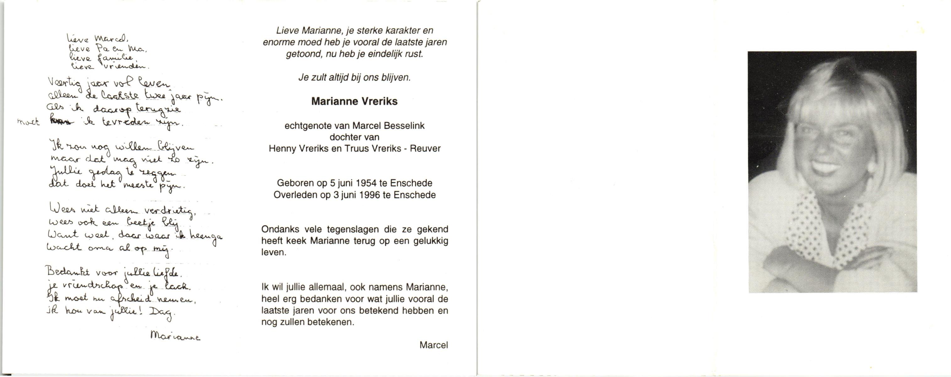 VRERIKS, Marianne, geboren op 5-6-1954 te Enschede, overleden op 3-6-1996 te Enschede op 41-jarige leeftijd.