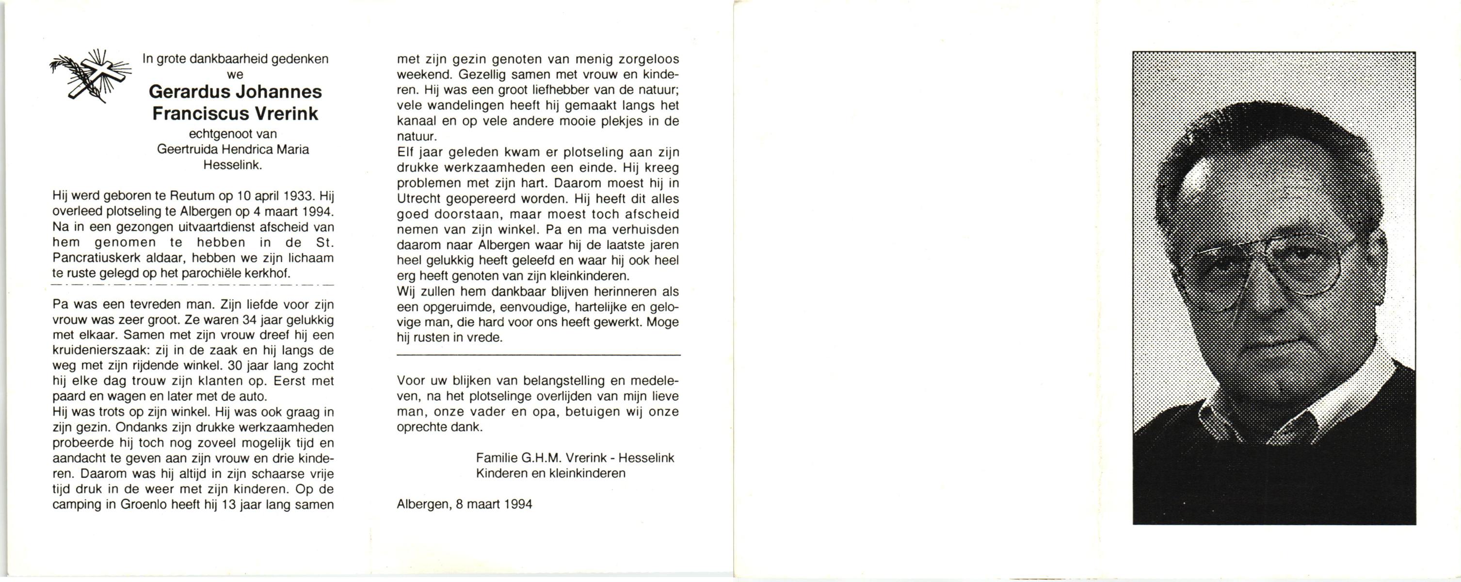 VRERINK, Gerardus Johannes Franciscus, geboren op 10-4-1933 te Reutum, overleden op 4-3-1994 te Albergen op 60-jarige leeftijd, begraven te Albergen.