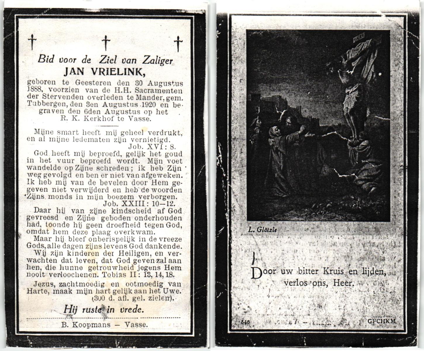 VRIELINK, Jan, geboren op 30-08-1888 te Geesteren, overleden op 3-8-1920 te Mander op 31-jarige leeftijd, begraven op 6-8-1920 te Vasse.