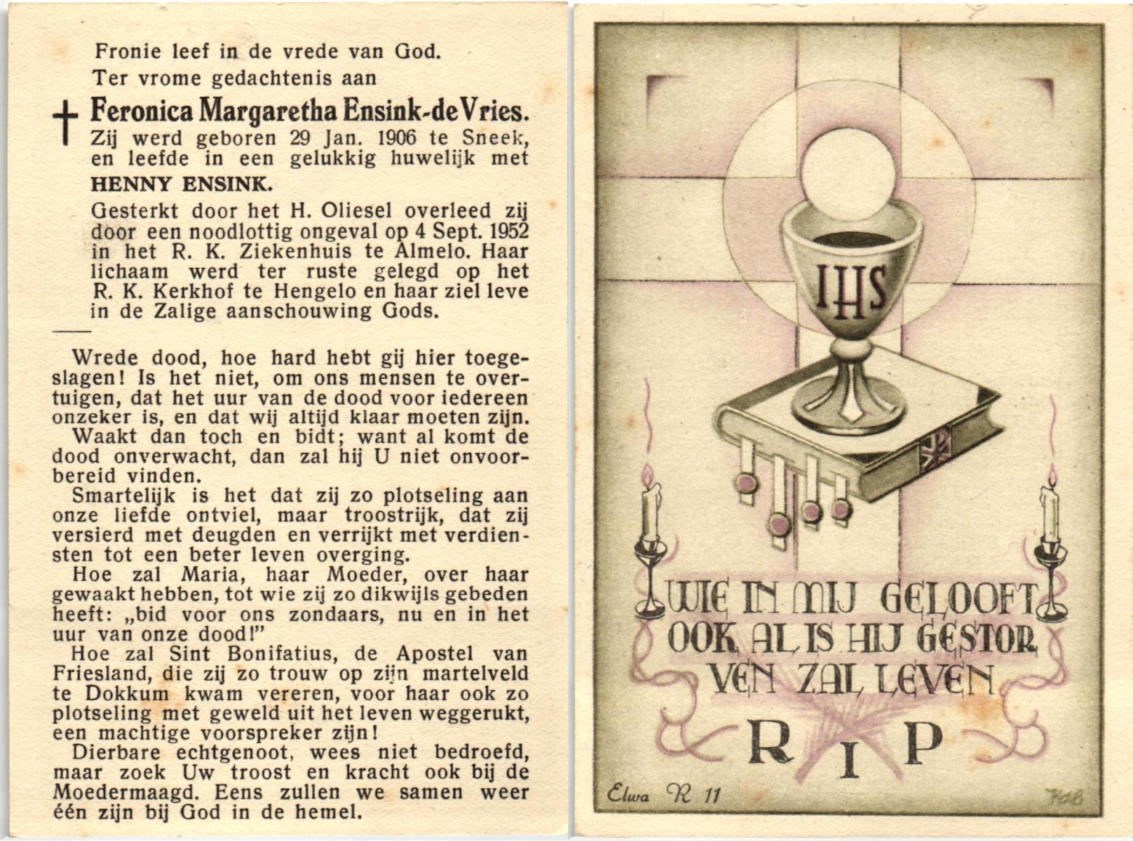 VRIES, de, Feronica Margaretha, geboren op 29-1-1900 te Sneek, overleden op 4-9-1952 te Almelo op 52-jarige leeftijd, begraven te Hengelo.