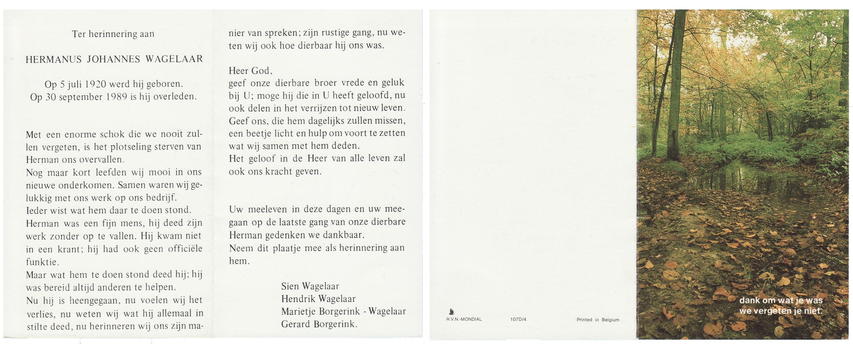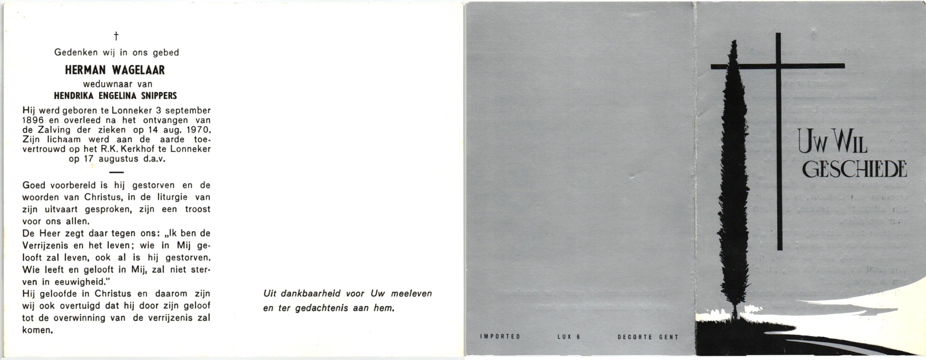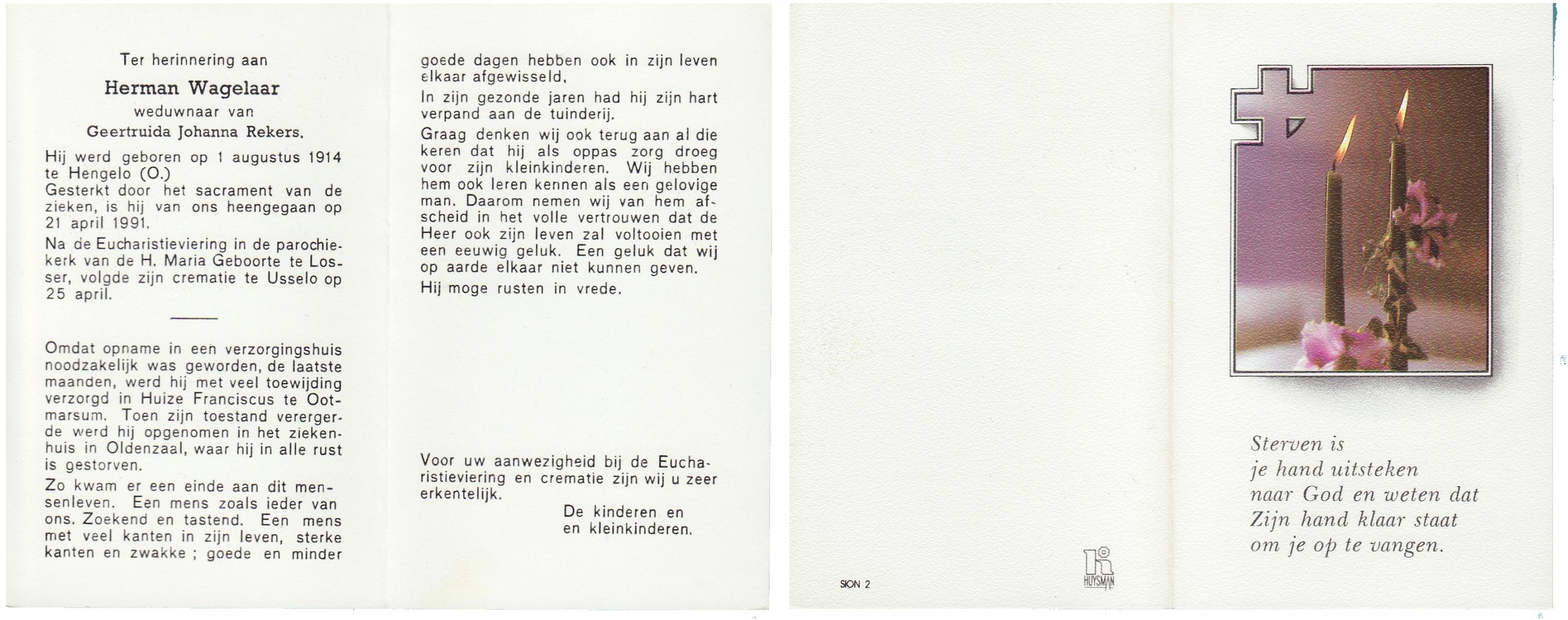 WAGELAAR, Herman, geboren op 1-8-1914 te Hengelo (O), overleden op 21-4-1991 op 76-jarige leeftijd, gecremeerd op 25-4-1991 te Usselo.