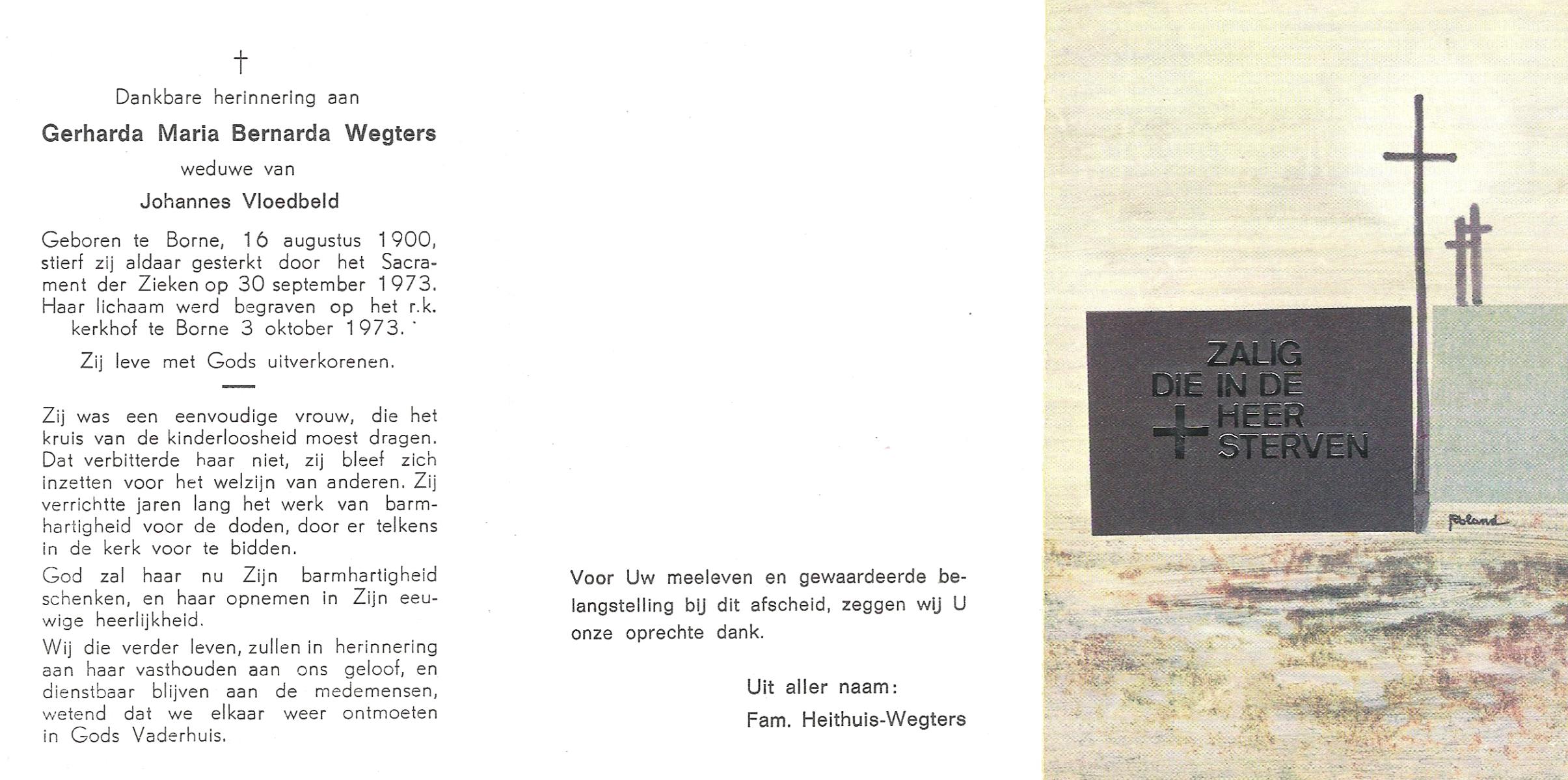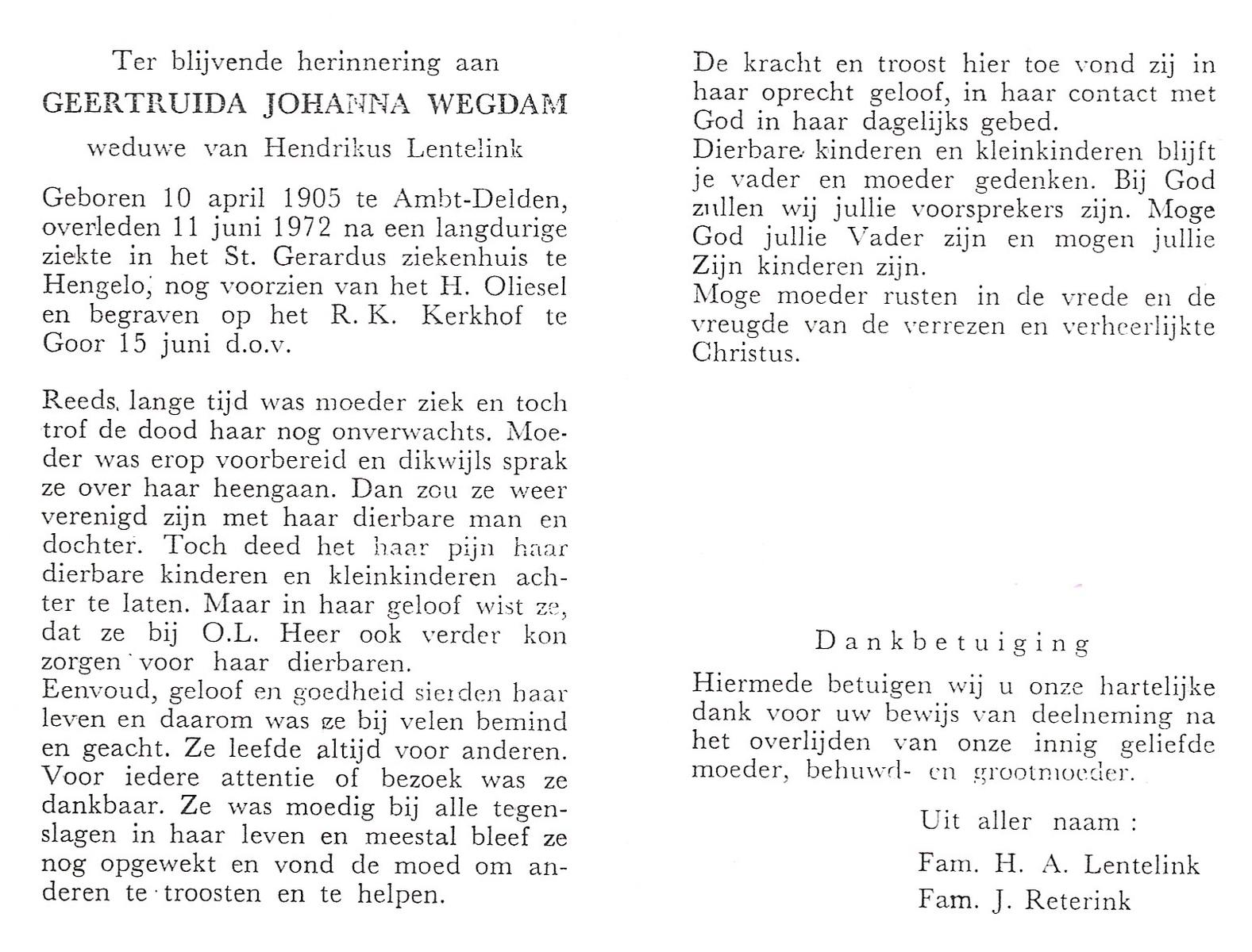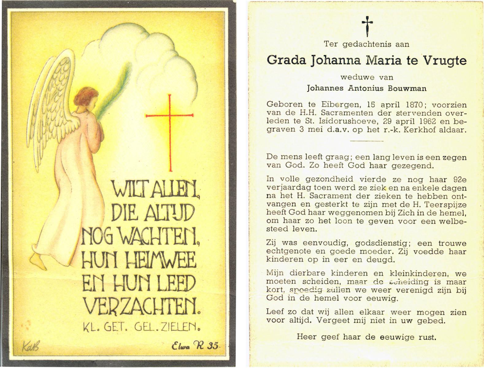 VRUGTE, te, Grada Johanna Maria, geboren op 15-04-1870 te Eibergen, overleden op 29-4-1962 te St. Isidorushoeve op 92-jarige leeftijd, begraven op 3-5-1962 te St. Isidorushoeve.