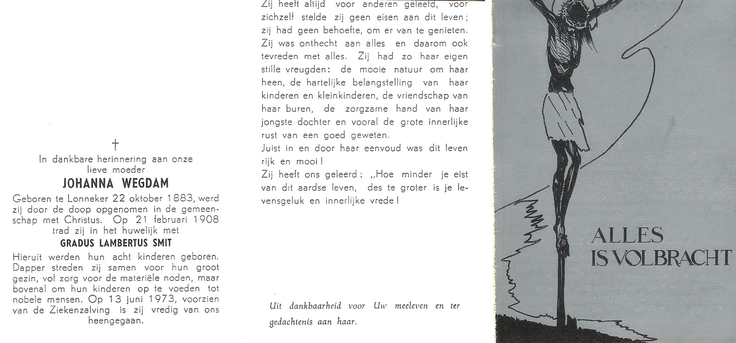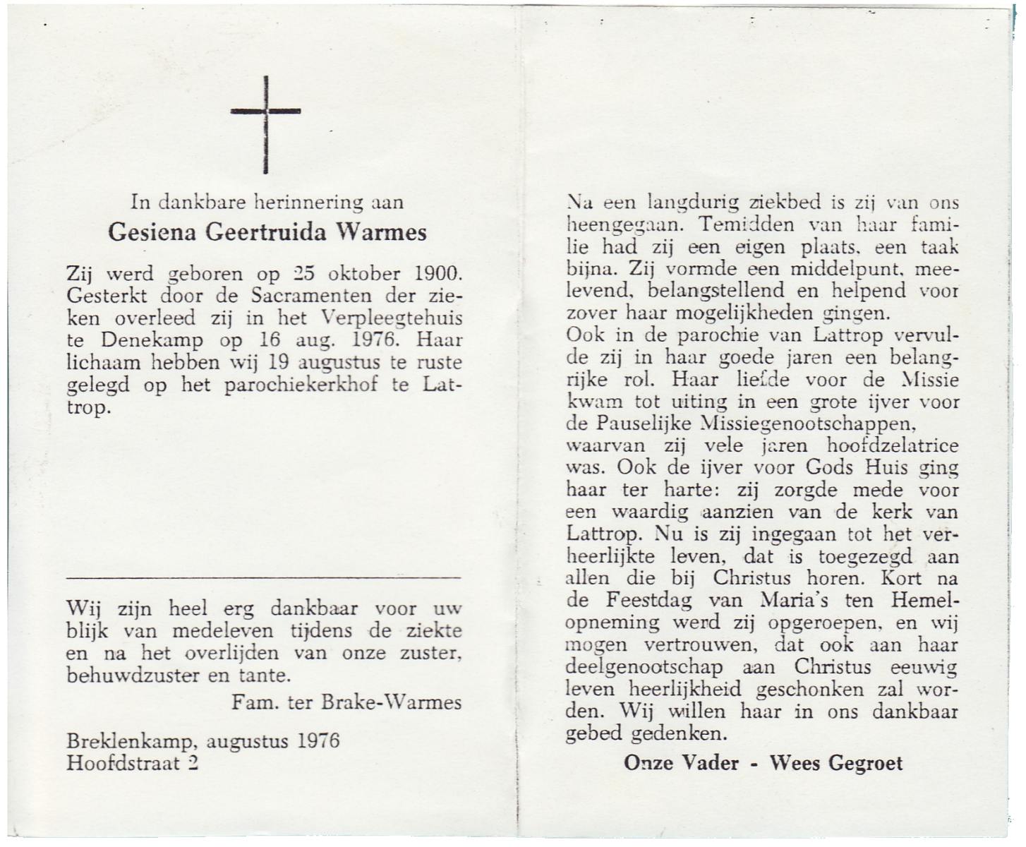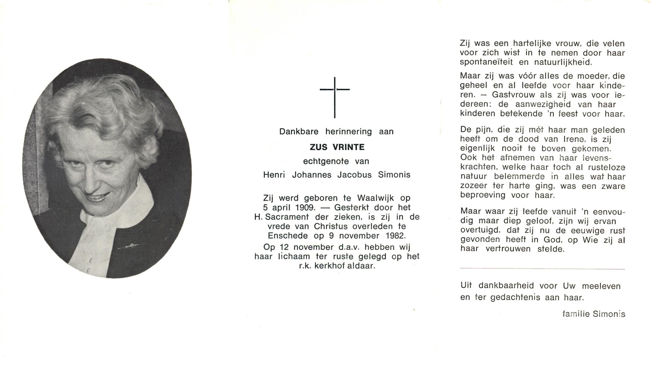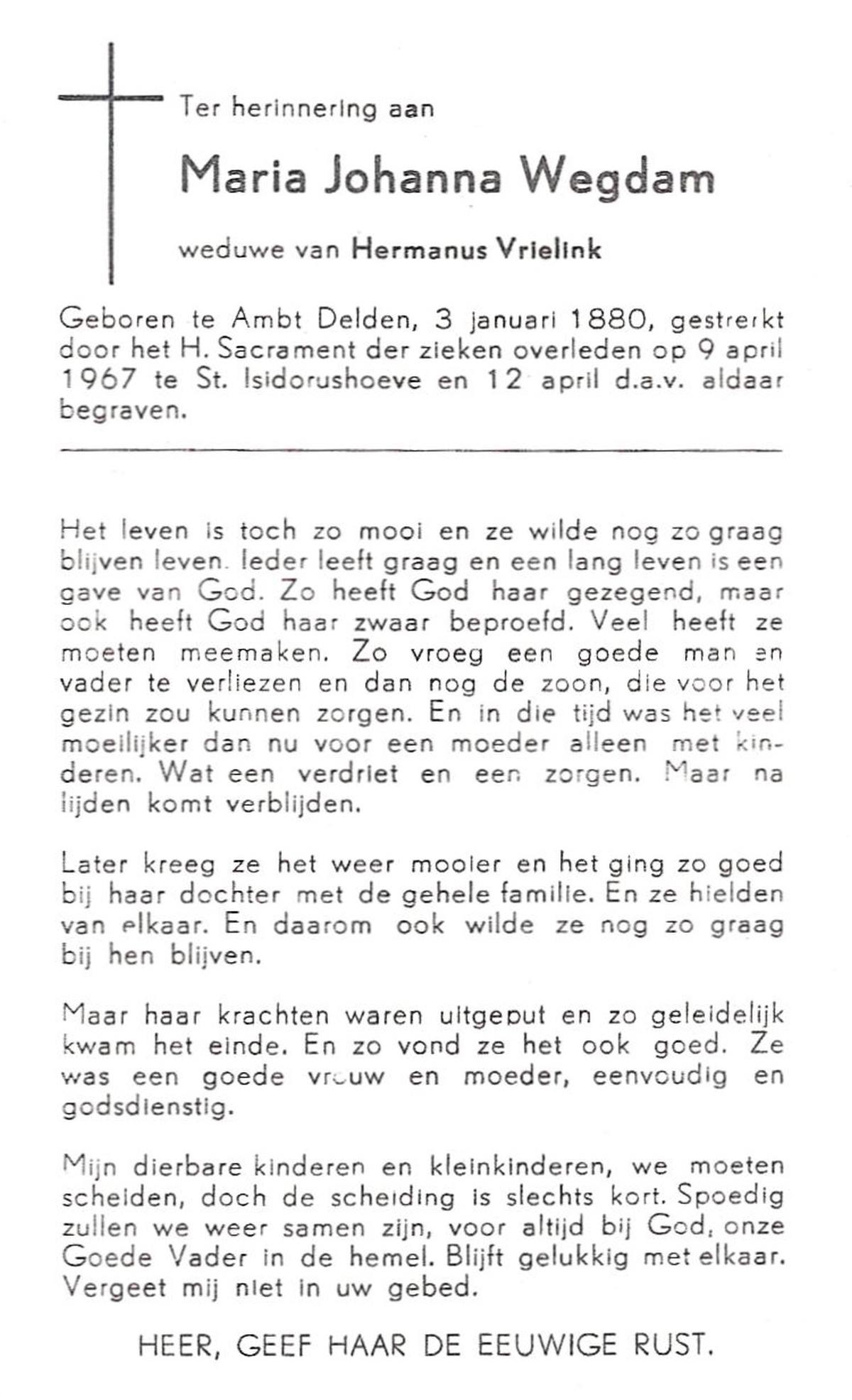VRUGTE, te, Grada Johanna Maria, geboren op 15-04-1870 te Eibergen, overleden op 29-4-1962 te St. Isidorushoeve op 92-jarige leeftijd, begraven op 3-5-1962 te St. Isidorushoeve.