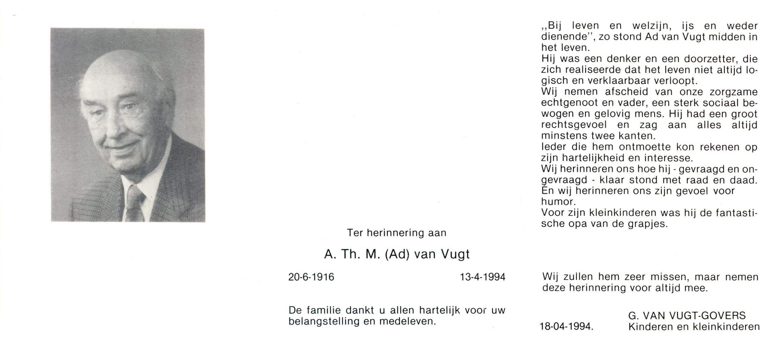 VUGT, van, Ad, geboren op 20-6-1916, overleden op 13-4-1994 op 77-jarige leeftijd.