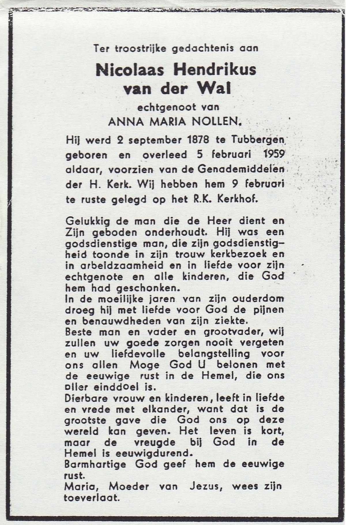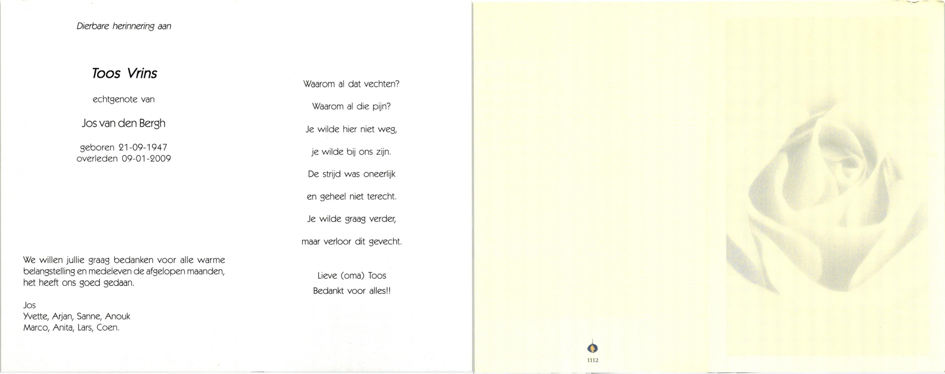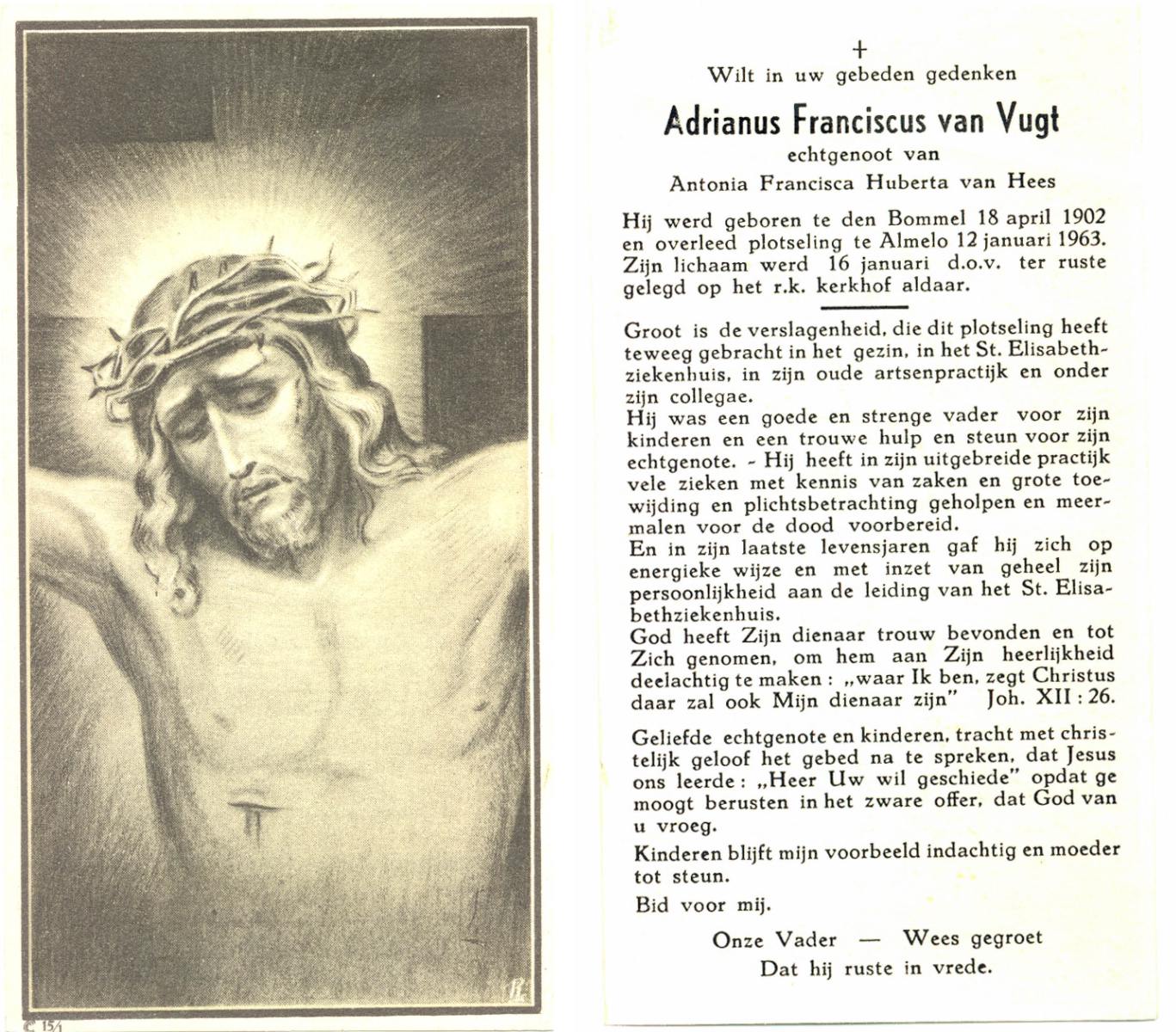 VUGT, van, Adrianus Franciscus, geboren op 18-4-1902 te Den Bommel, overleden op 12-1-1963 te Almelo op 60-jarige leeftijd, begraven op 16-1-1963 te Almelo R.K.Kerkhof.