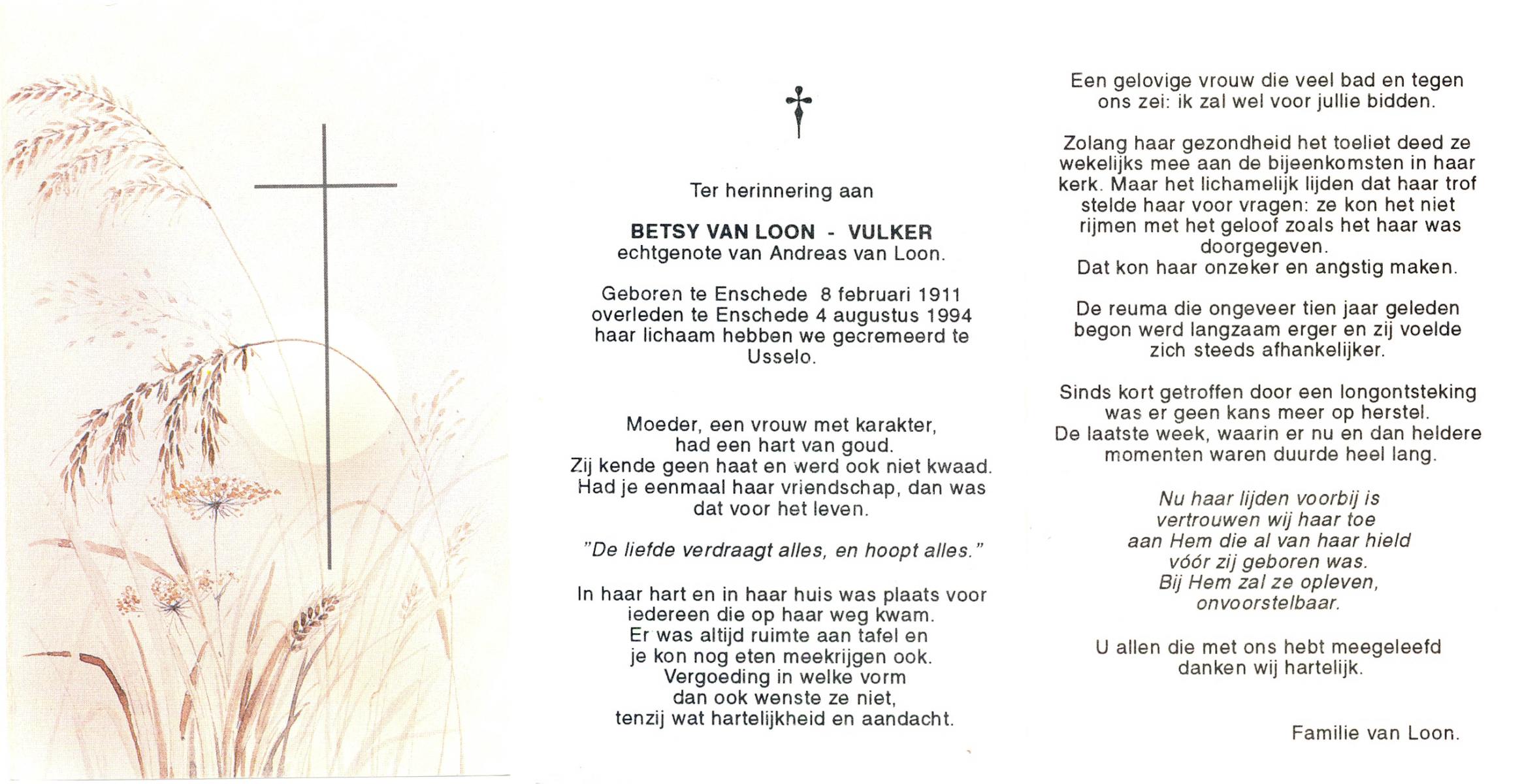 VULKER, Betsy, geboren op 8-2-1911 te Enschede, overleden op 4-8-1994 te Enschede op 83-jarige leeftijd, gecremeerd op 00-08-1994 te Usselo.