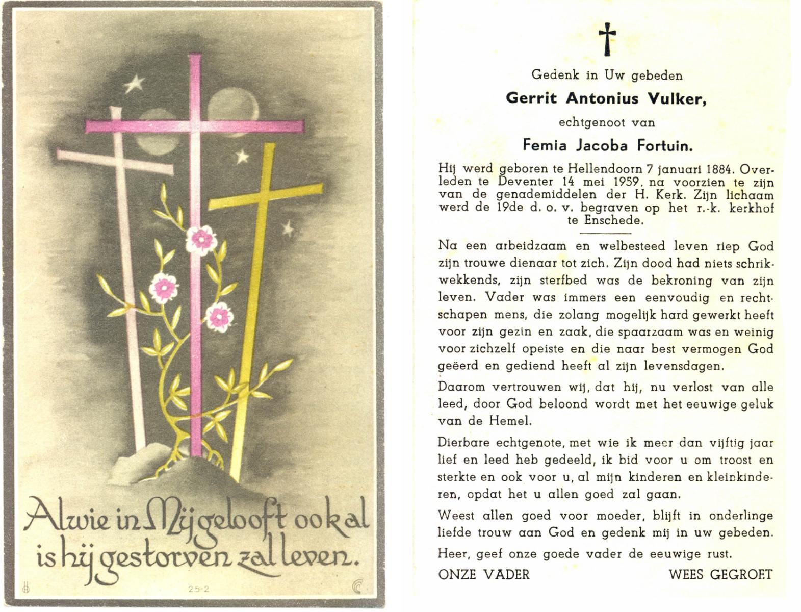 VULKER, Gerrit Antonius, geboren op 07-01-1884 te Hellendoorn, overleden op 14-5-1959 te Deventer op 75-jarige leeftijd, begraven op 19-5-1959 te Enschede.