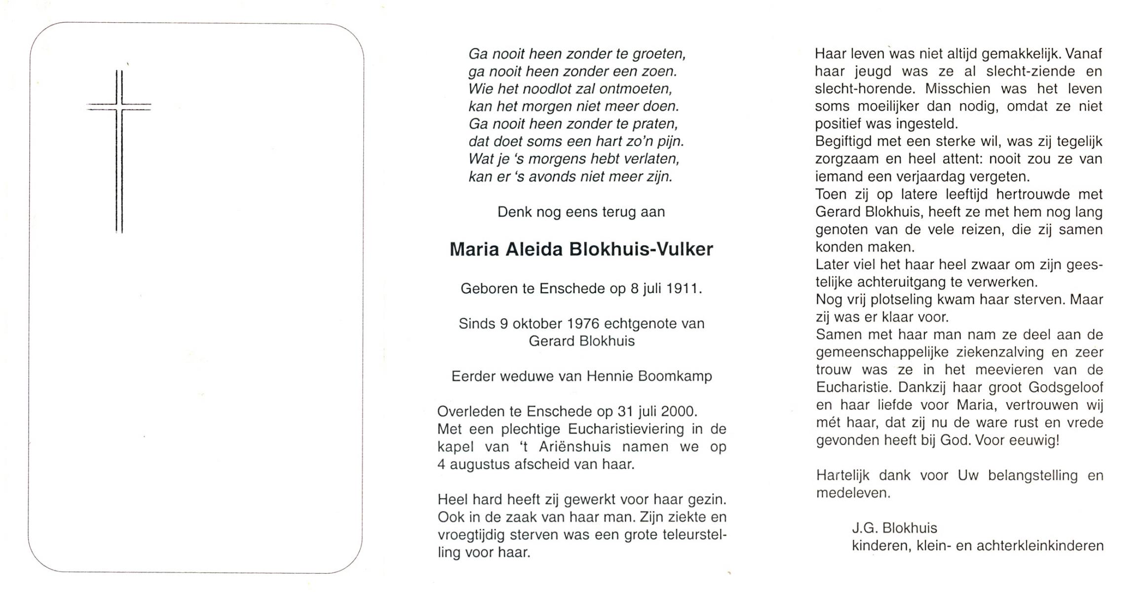 VULKER, Maria Aleida, geboren op 8-7-1911 te Enschede, overleden op 31-7-2000 te Enschede op 89-jarige leeftijd.